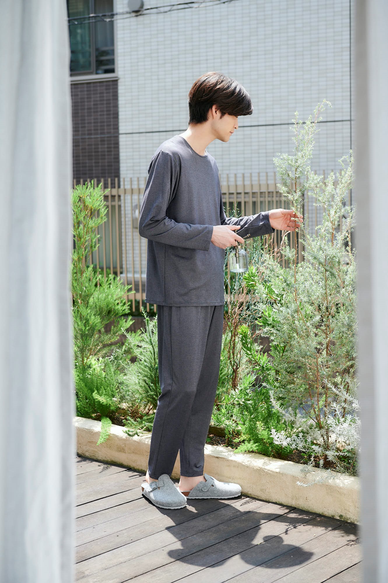 働き方や生活が多様化する時代で頑張るすべての人が、おうちで過ごすリラックスタイムなどは無理をせず、自然体で過ごせるように、そんな想いのこもった『COMFORT W』シリーズ。見た目からもリラックス感が出るようゆったりとしたサイズ設計で、身幅やアームホール、袖幅のゆとりが着ていて心地よく、着脱しやすい仕様にしました。生地のしなやかなハリ・コシ・弾力性がラフ過ぎないすっきりとした印象を演出してくれます。