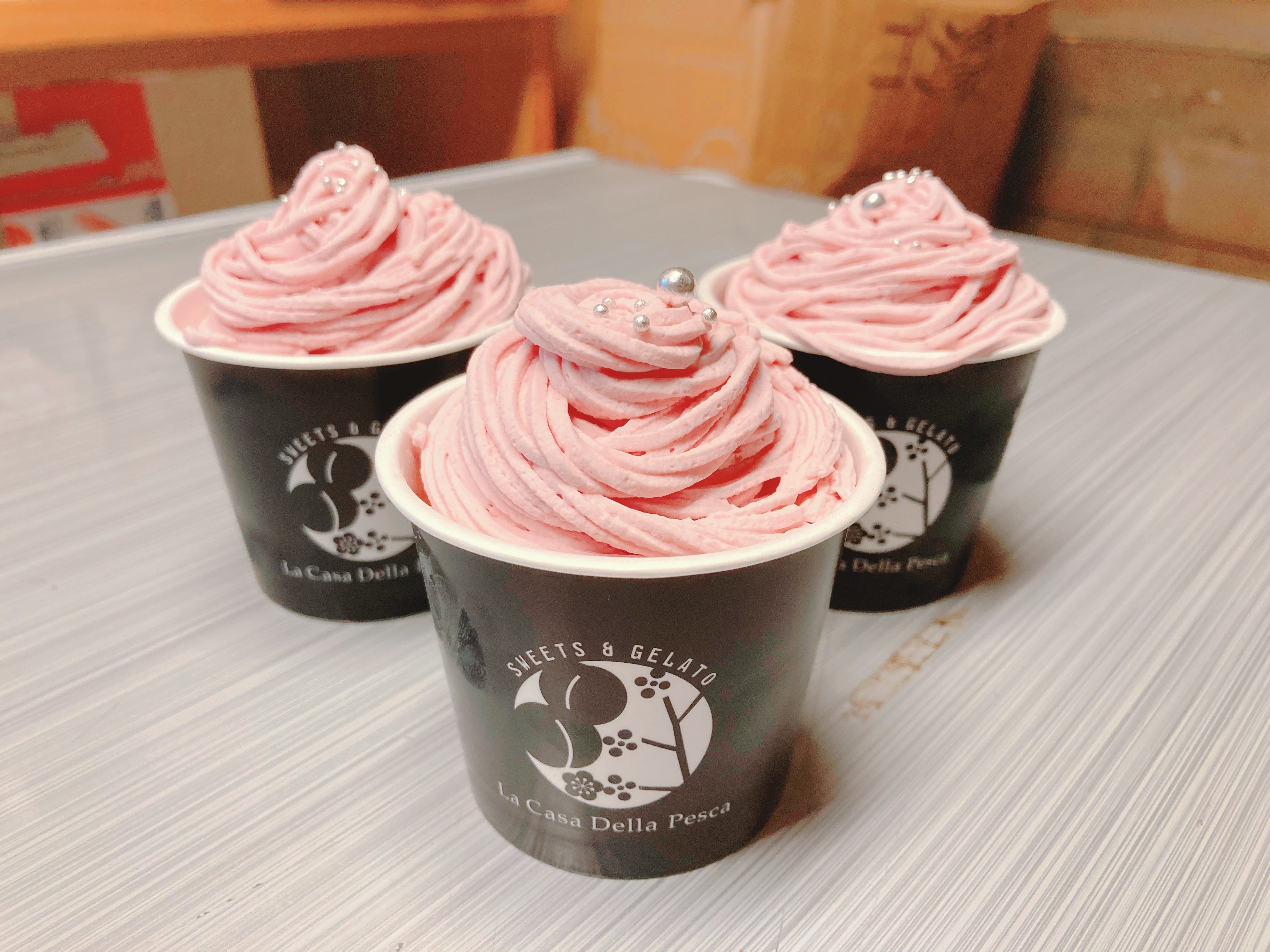 桃以 外にも、干し柿ミルクや桃チーズジェラートの上に桃のモンブランクリームをトッピングした『桃モンブラン(あいぱく®東京初登場)』も販売!さらにお持ち帰りのカップアイスも販売します。