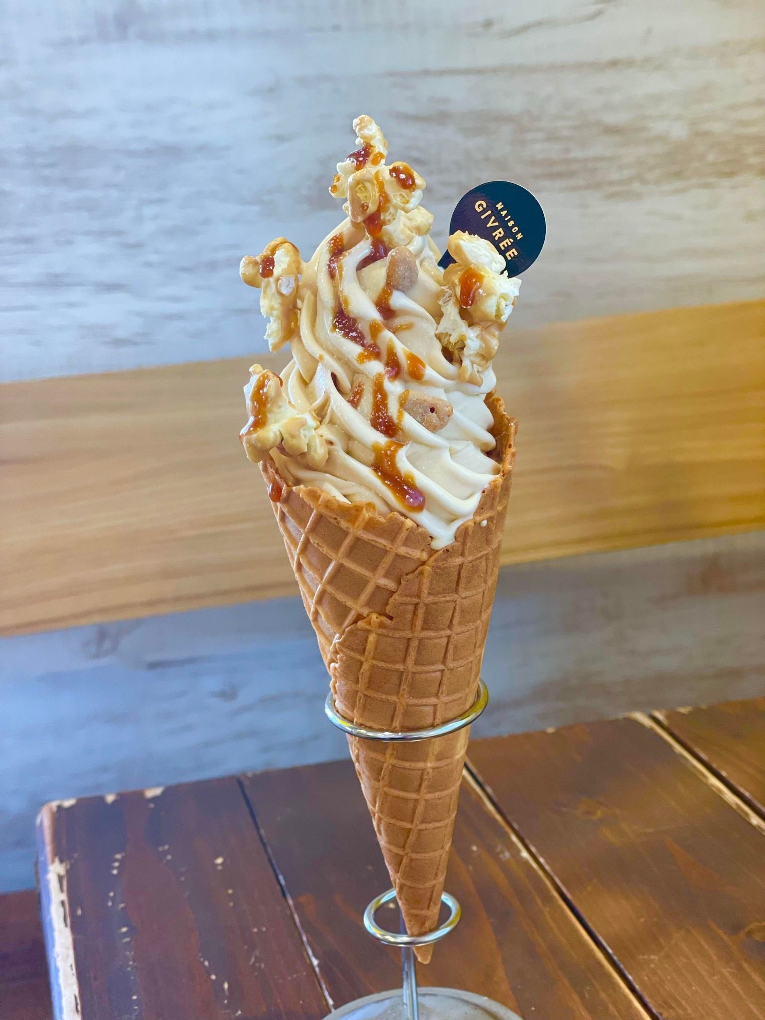 「ゴールドチョコレート」アイスクリームの上に、北海道産の白いとうもろこし『ロイシーコーン』のソフトクリームをのせ、仕上げにポップコーンとキャラメルソースをトッピングした贅沢なソフトクリームです。