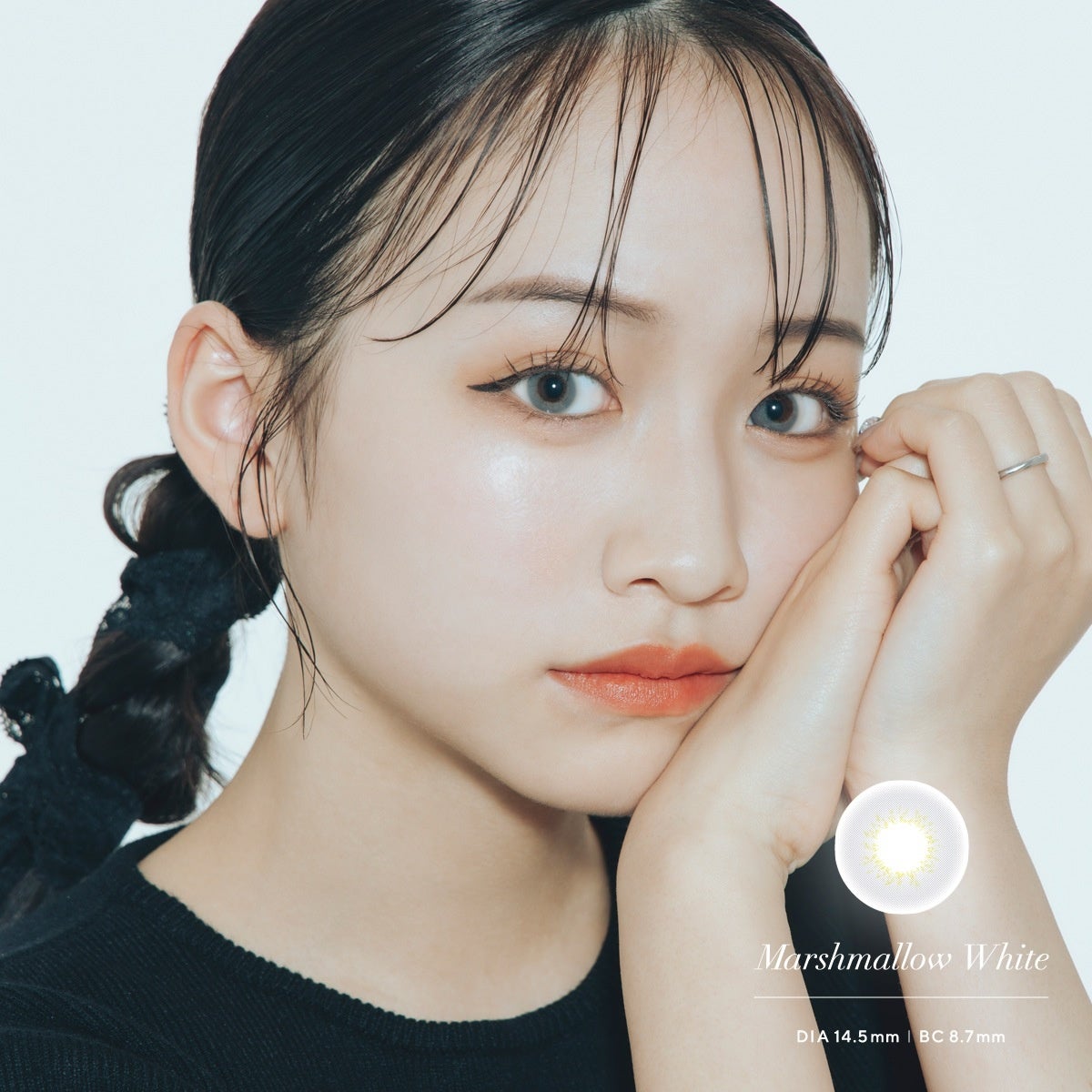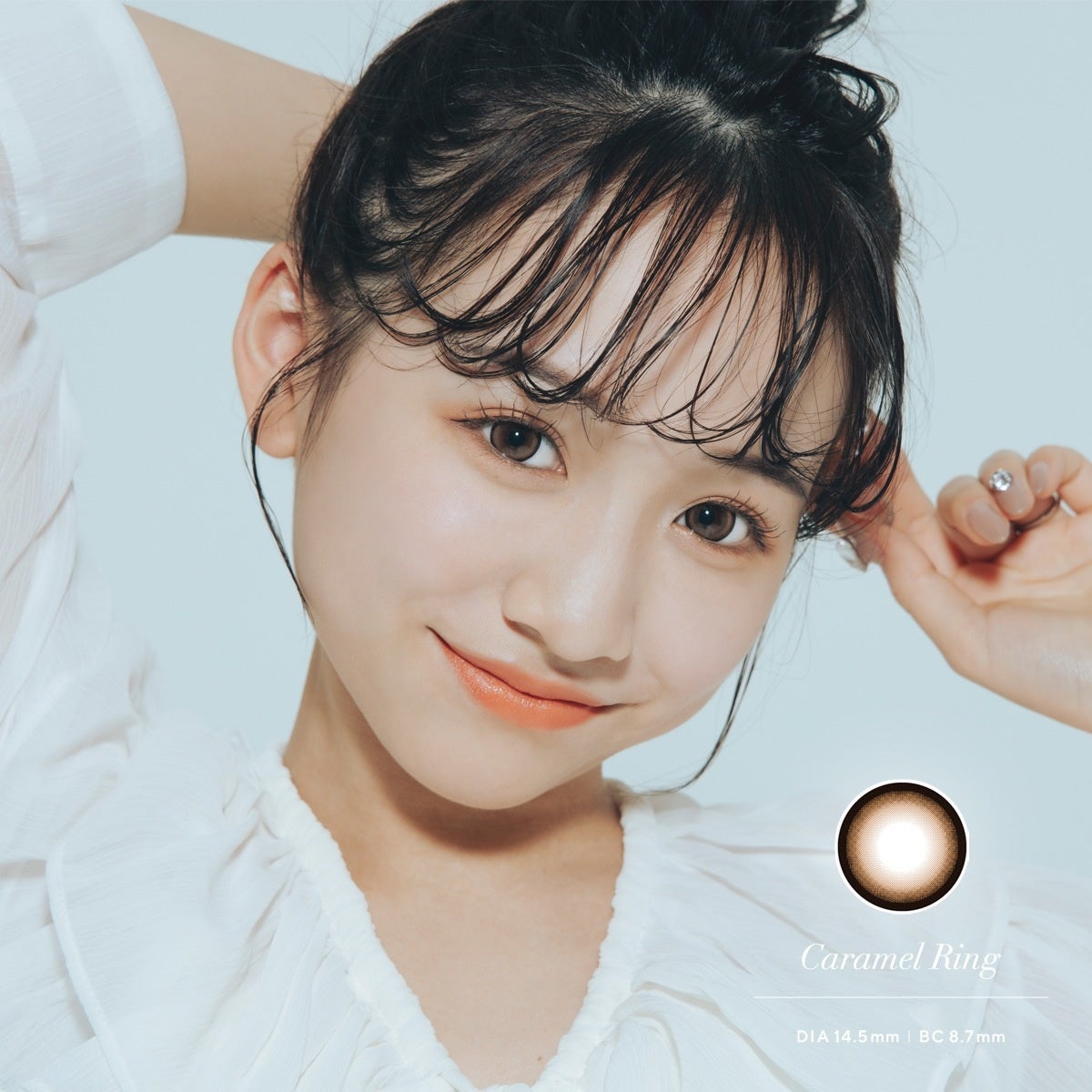 瞳を縁取るブラックのリングに、内側は透け感のあるオレンジブラウンのグラデーションというカラーの組み合わせ。縁と内側のコントラストで、ちゅるんとしたツヤっぽさ、クリクリとした大きく可愛らしいドールアイな印象を与えます。