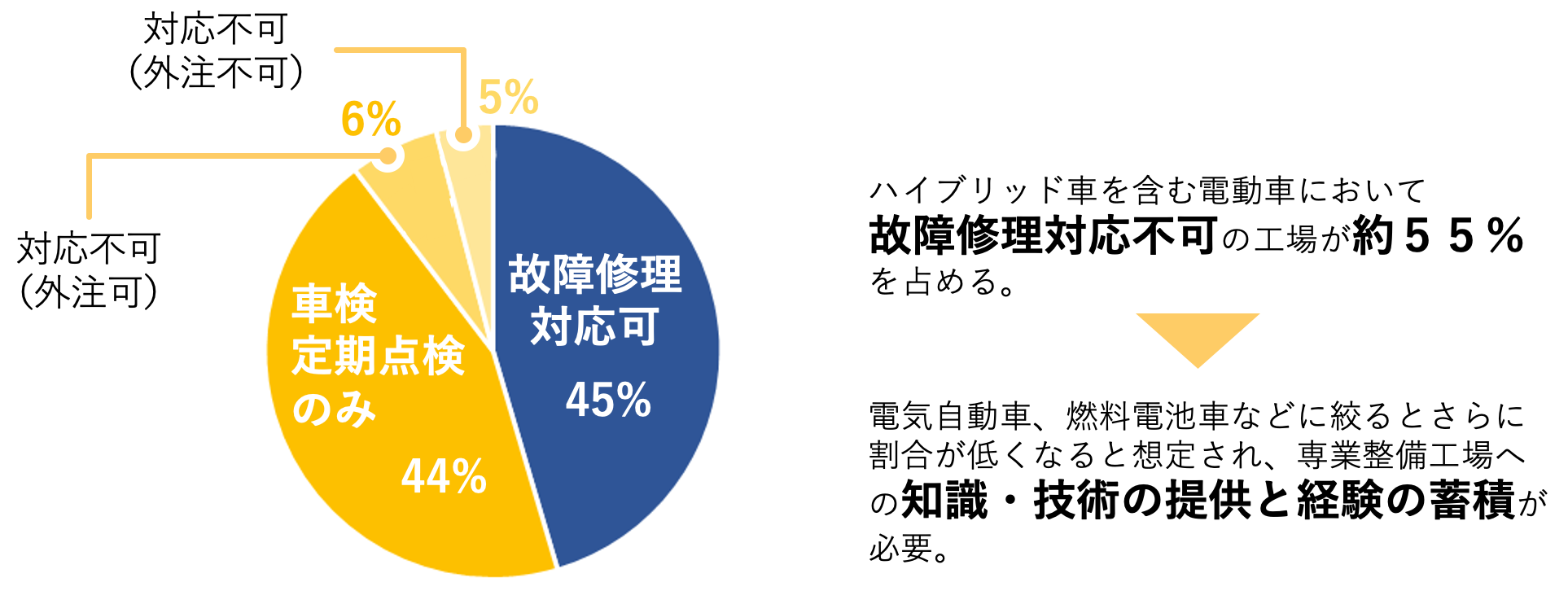 整備士の人数や設備、整備技術などのさまざまな要因により、車検・点検にリソースを集中配分する方針の整備工場や、電動化が進む中で新しい技術や知識をどう習得すれば良いかわからないなど、試行錯誤している整備工場の存在が垣間見えます。