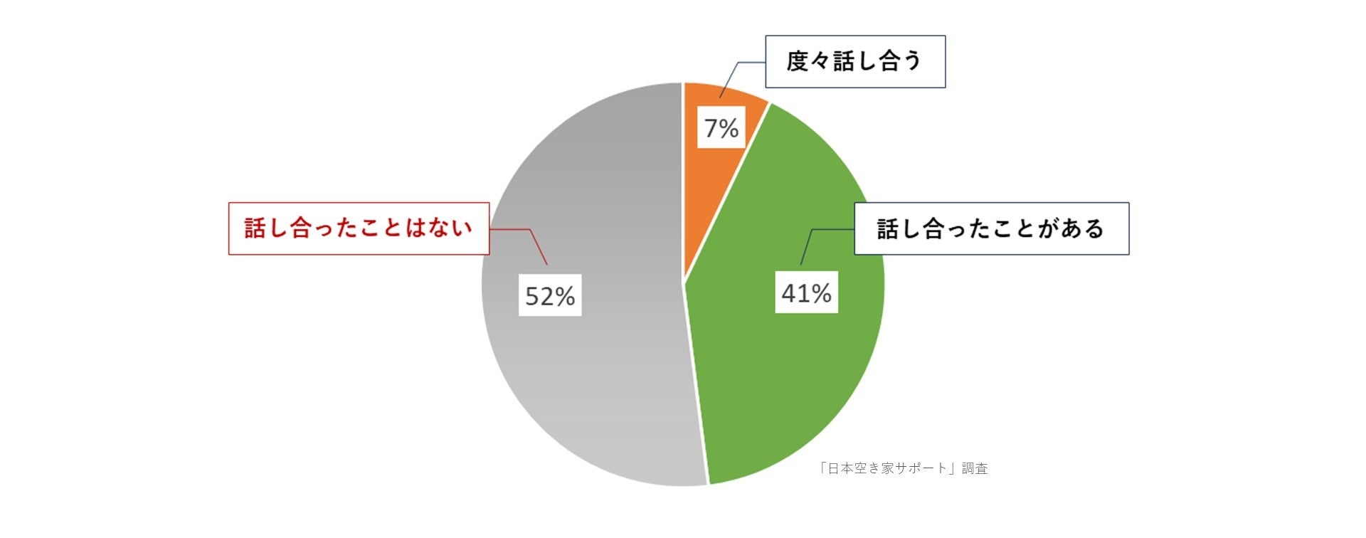 半数近くの回答者が話し合ったことがあるという結果に。問2-1同様、空家法の改正強化、空き家に関するメディア報道の増加などが影響している可能性が考えられる。過去に比較する調査結果はないものの、空き家に関して意識する層が増えていることが窺われる。