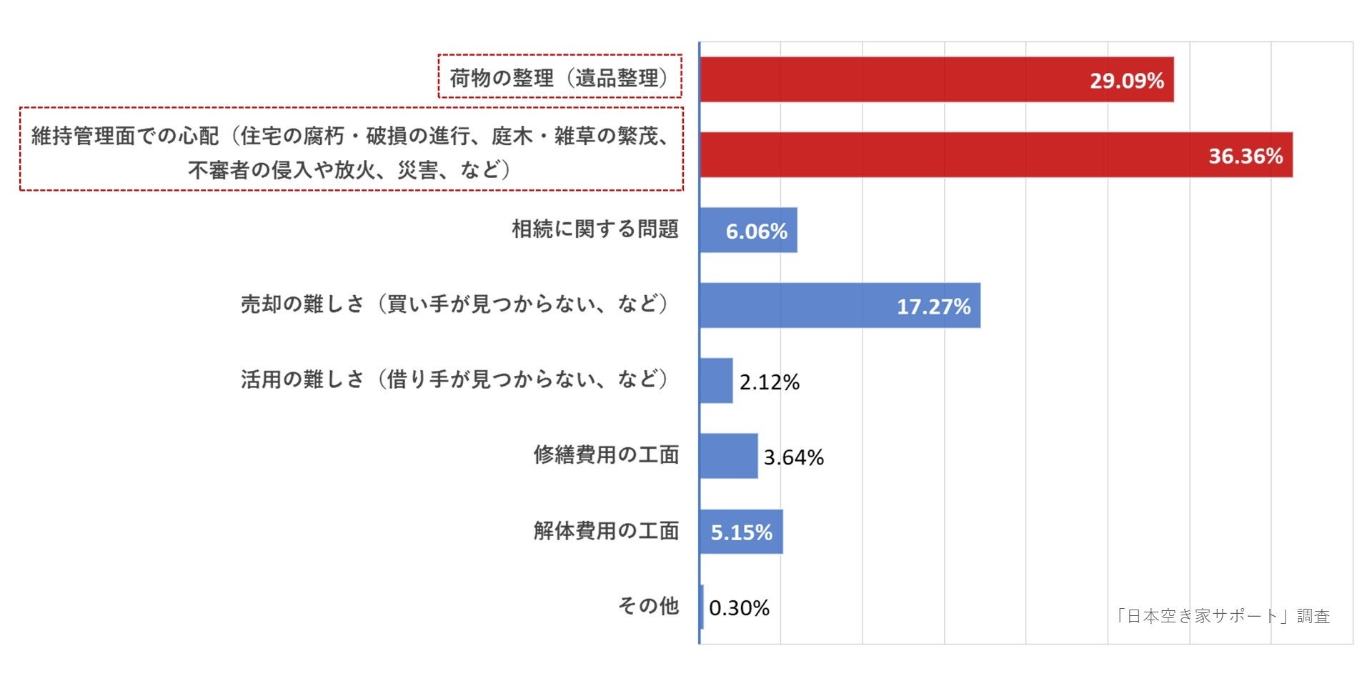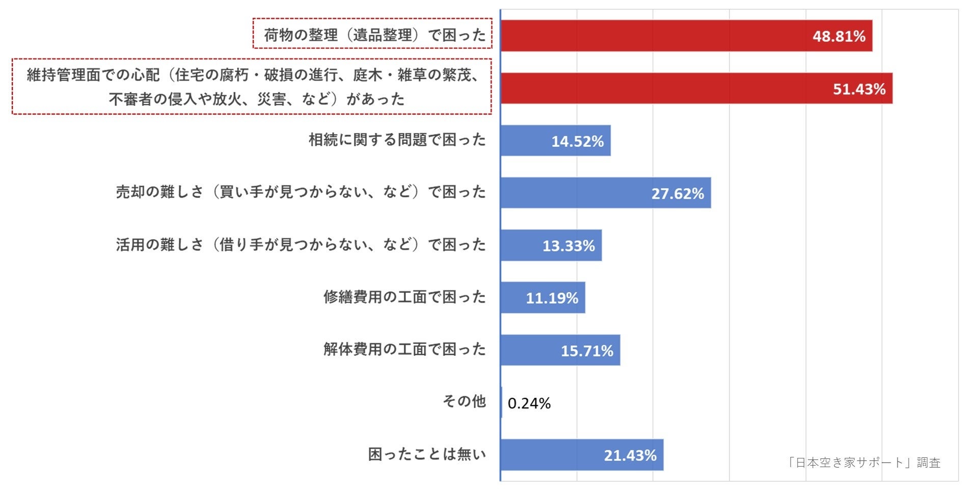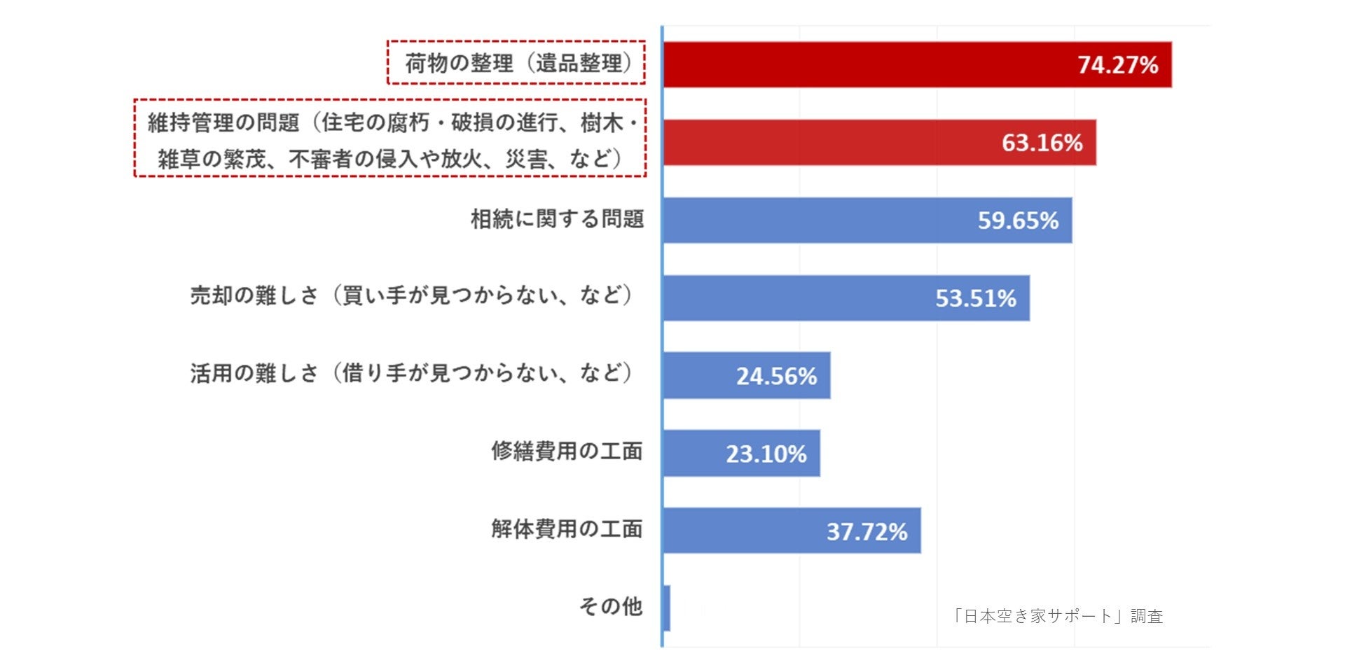 空き家予備軍の多くが実家が空き家になったときに困ると想定していた「1位:親の荷物の整理(遺品整理)」と「2位:空き家の維持管理」が、空き家経験者の現実でも最も多くの回答を占める結果に。