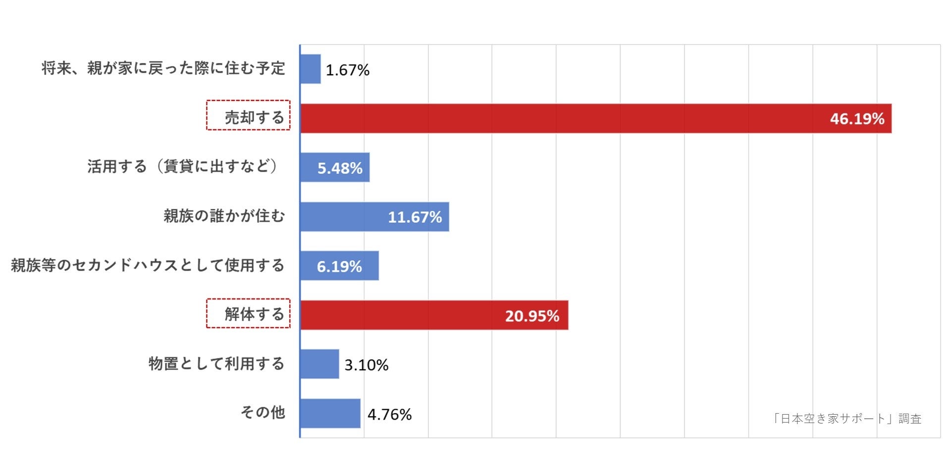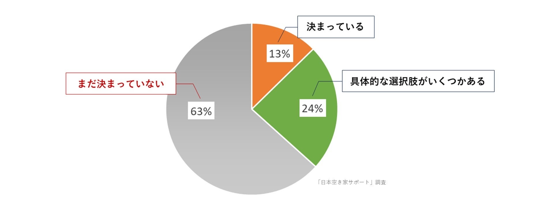 (空き家予備軍)がまだ空き家になっていない状態であることを考慮すると、親の持ち家、すなわち実家の将来について「決まっている」「選択肢がある」と回答した割合が合計で4割程度である点は想定より高い結果であった。空家法の改正強化、空き家に関するメディア報道の増加などが影響している可能性も。