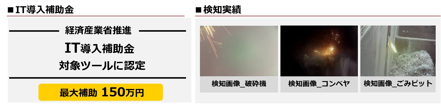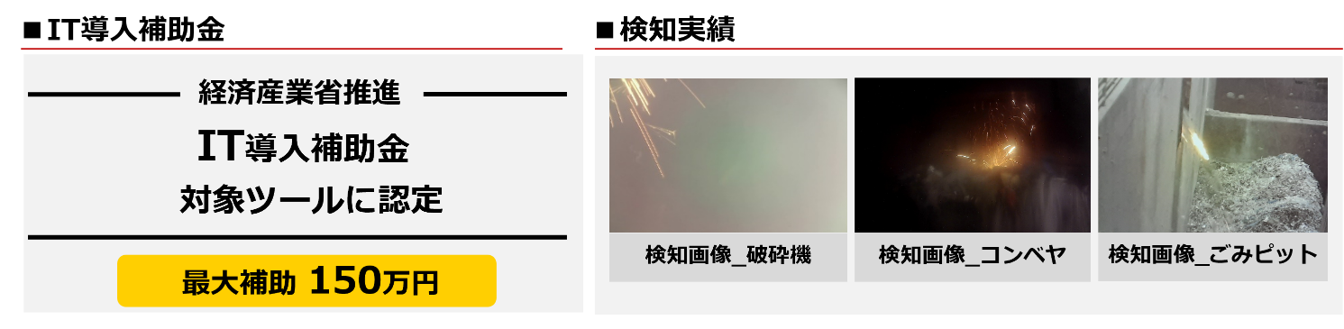 2020年6月以降、既に民間や自治体における廃棄物処理施設における導入実績があり、これまで導入先において火災延焼『ゼロ』の実績が得られています。また、本システムは経済産業省のIT導入補助金2024の支援ツールとして認定されています。