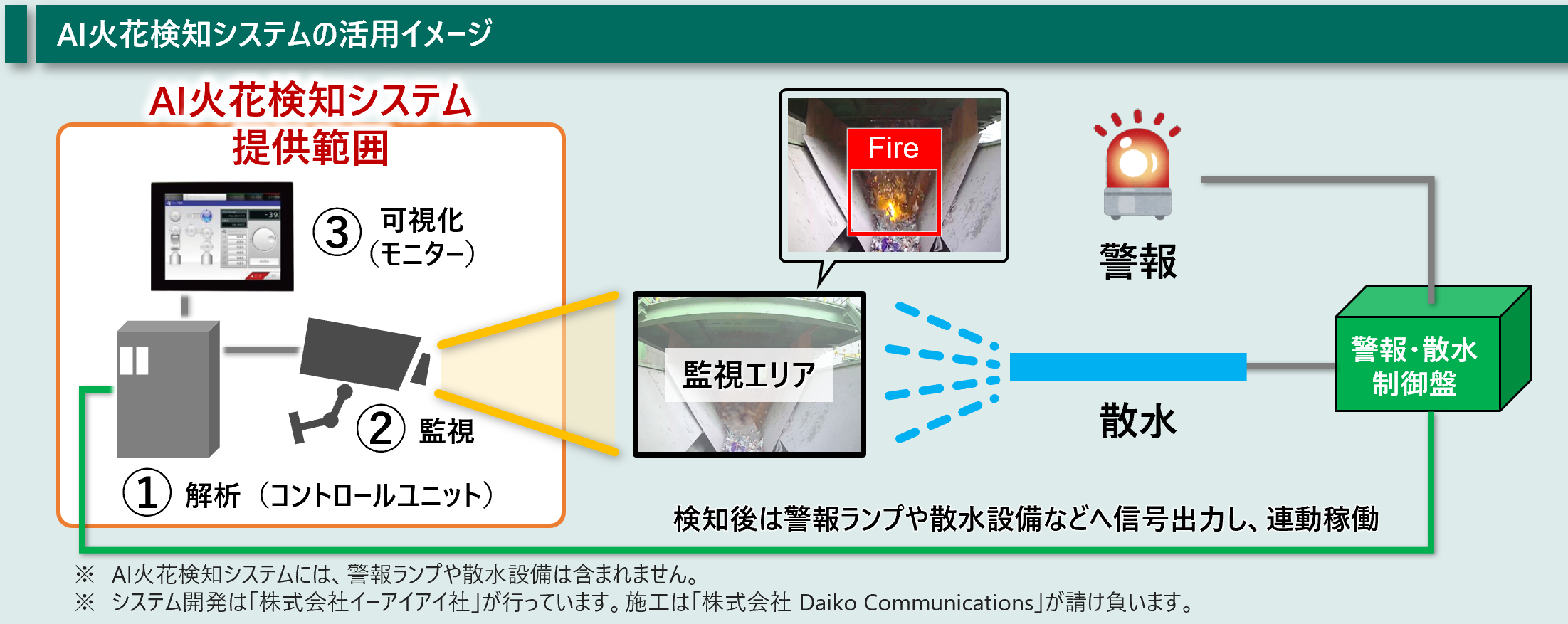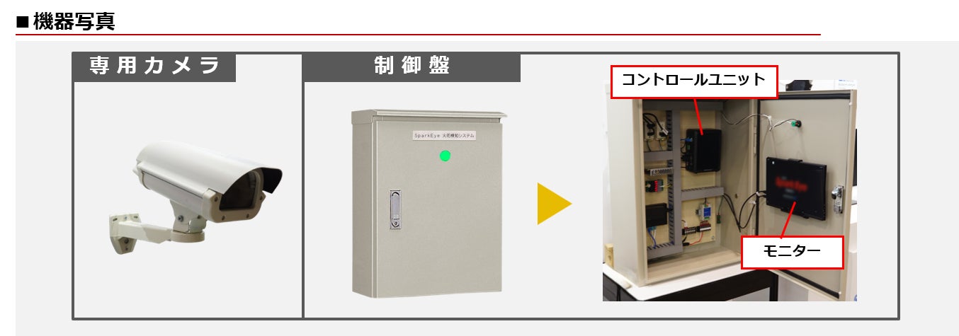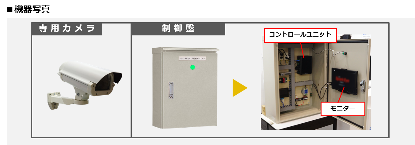 本システムは、火災時に発生する火花や火をAI画像認識の技術(特許取得済み)を用いて瞬間的(0.05秒)に自動検知し、警報設備や消火設備(別途)と自動連動することで火災の延焼を防止するシステムです。カメラ映像で検知できるため、ガラスやアクリル越しに設置することができ、覆蓋化された機器内部の検知も可能になります。また、検知データ(検知画像、日時、検知開始時間、終了時間等)の可視化ができ、火災状況の分析にも役立ちます。