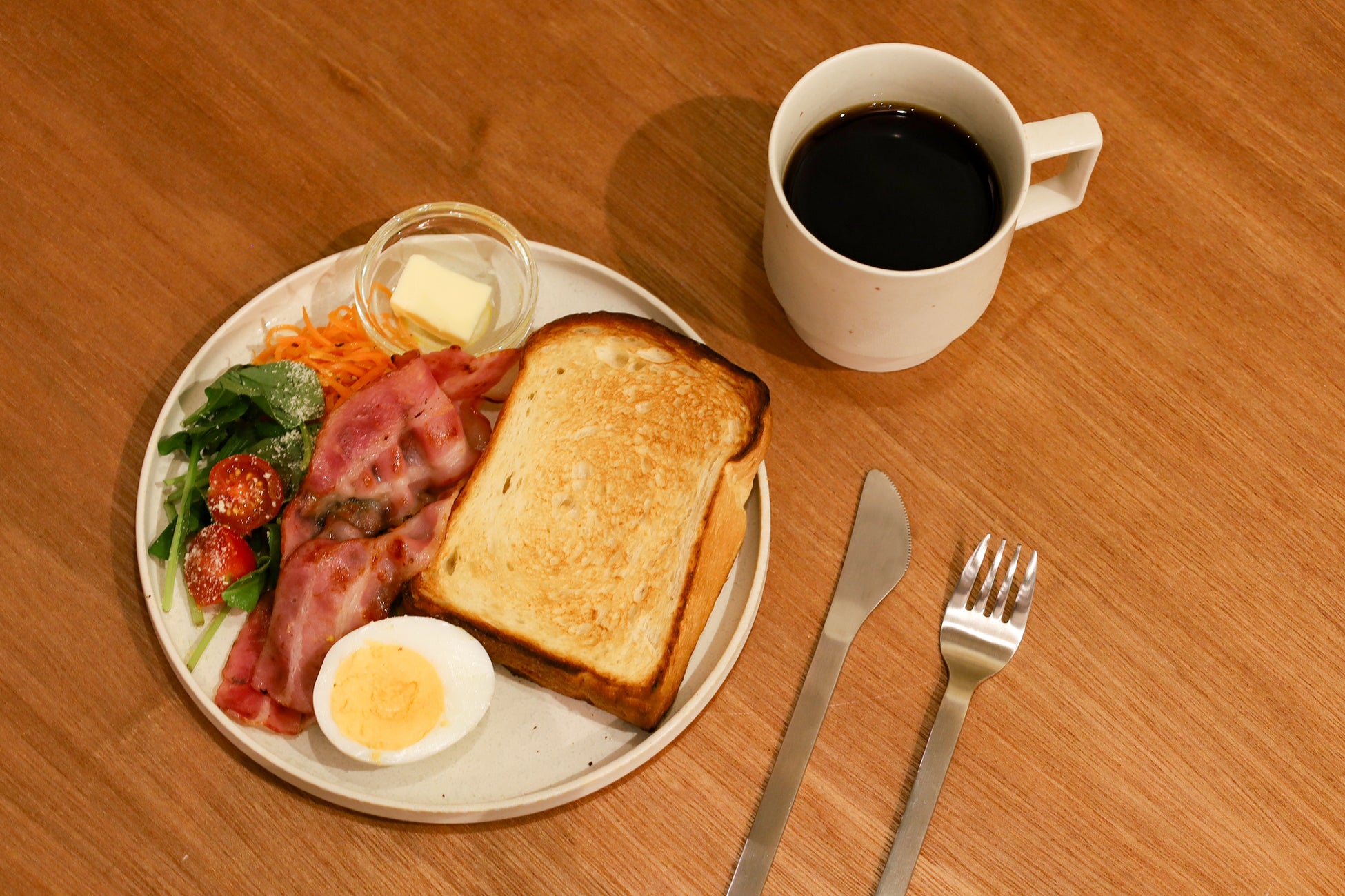 注文が入ってから作るモーニングプレートやランチプレート、パンを使ったデザートなどのメニューも豊富に用意しています。モーニングに使用するOUI.の山食は、甘味を最大限感じられるようにミルクを100%使用して焼き上げました。トーストすると、麦芽粕由来の香ばしい香りが広がります。