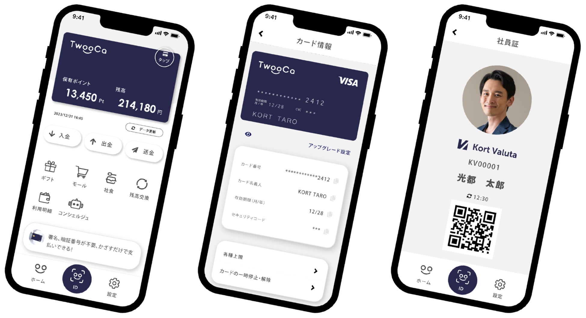 Kort Valutaが提供する、スマートフォンで利用するデジタルハイブリッド社員証アプリ。社員証としての機能に加え『電子決済』『社員間送金』『福利厚生(社員様へのデジタルポイント付与)』『経費精算』『出退勤管理』『ショッピングモール』『音声によるストレスチェック』など、様々な機能・サービスを用意。導入企業の課題に応じ、機能・サービスをカスタマイズして提供することが可能。