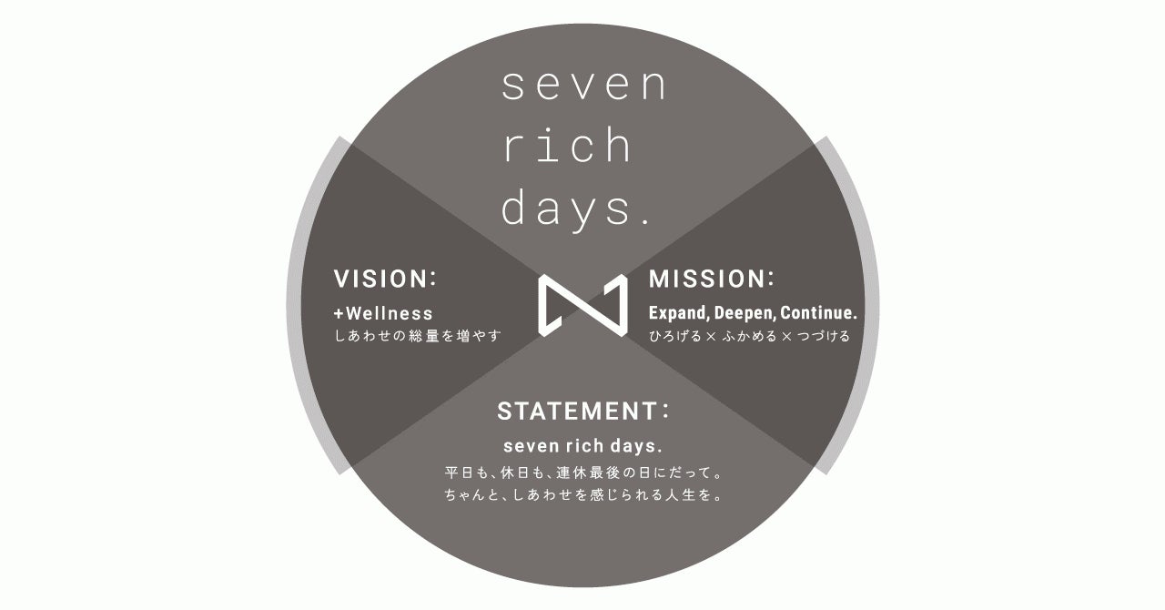 ・VISION:+Wellness しあわせの総量を増やす・MISSION:Expand,Deepen,Continue. ひろげる × ふかめる × つづける