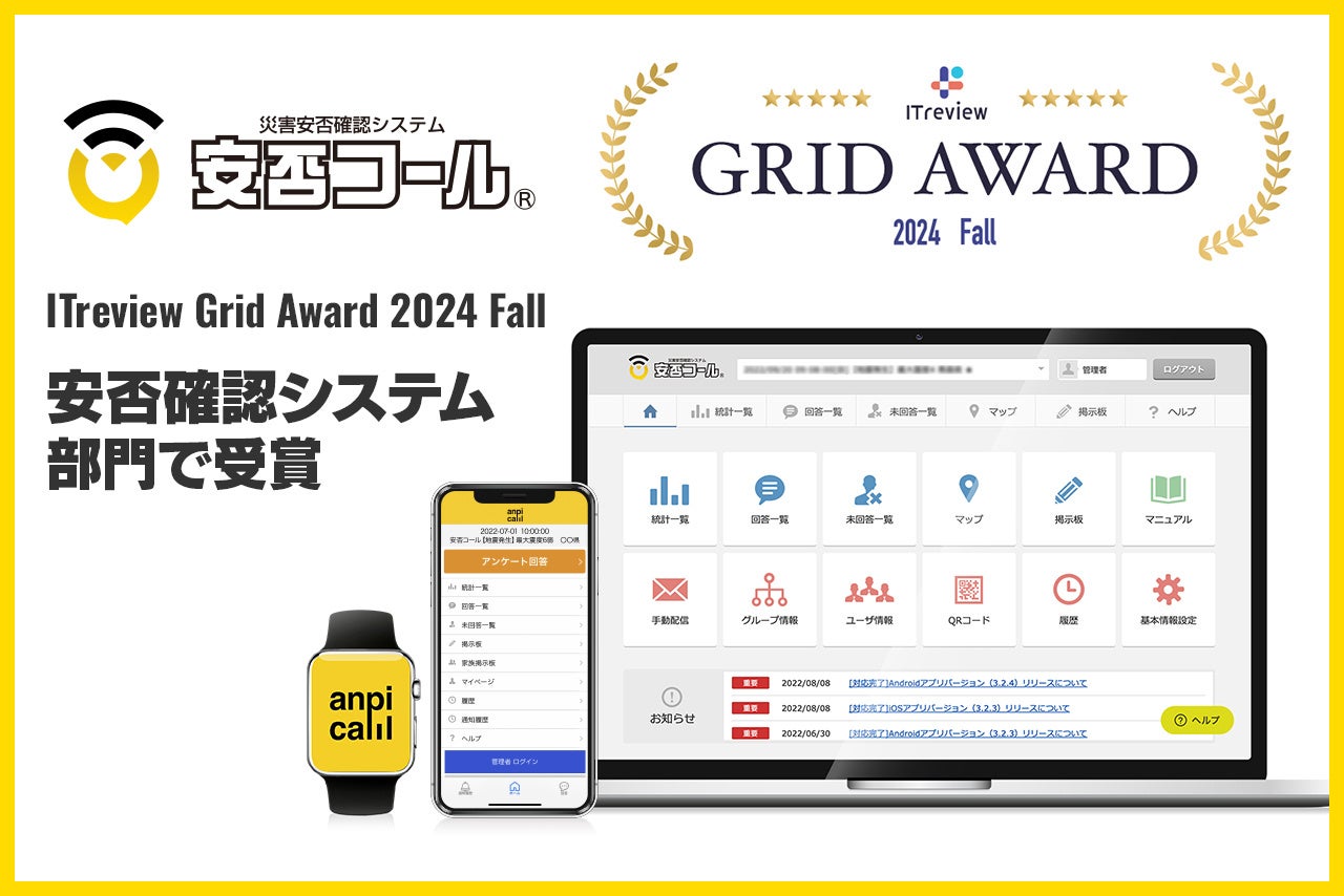 安否確認システム「安否コール」が、ITreview Grid Award 2024 Fall 「安否確認システム」部門で受賞