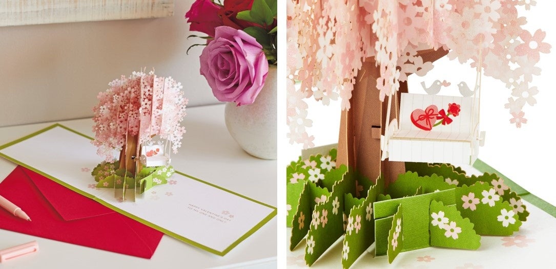 海外でも注目度が高まっている「桜」がテーマのバレンタインカードは、木の部分から白いブランコのパーツがぶら下がっています。