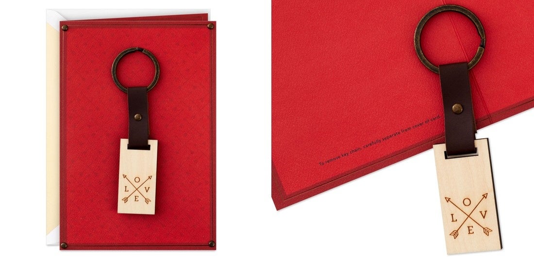 一見シンプルでシックな赤い表紙のカードは、なんと取り外せるキーチェーン付き! 大切な人にさりげなくギフトとして贈りたい一品です。