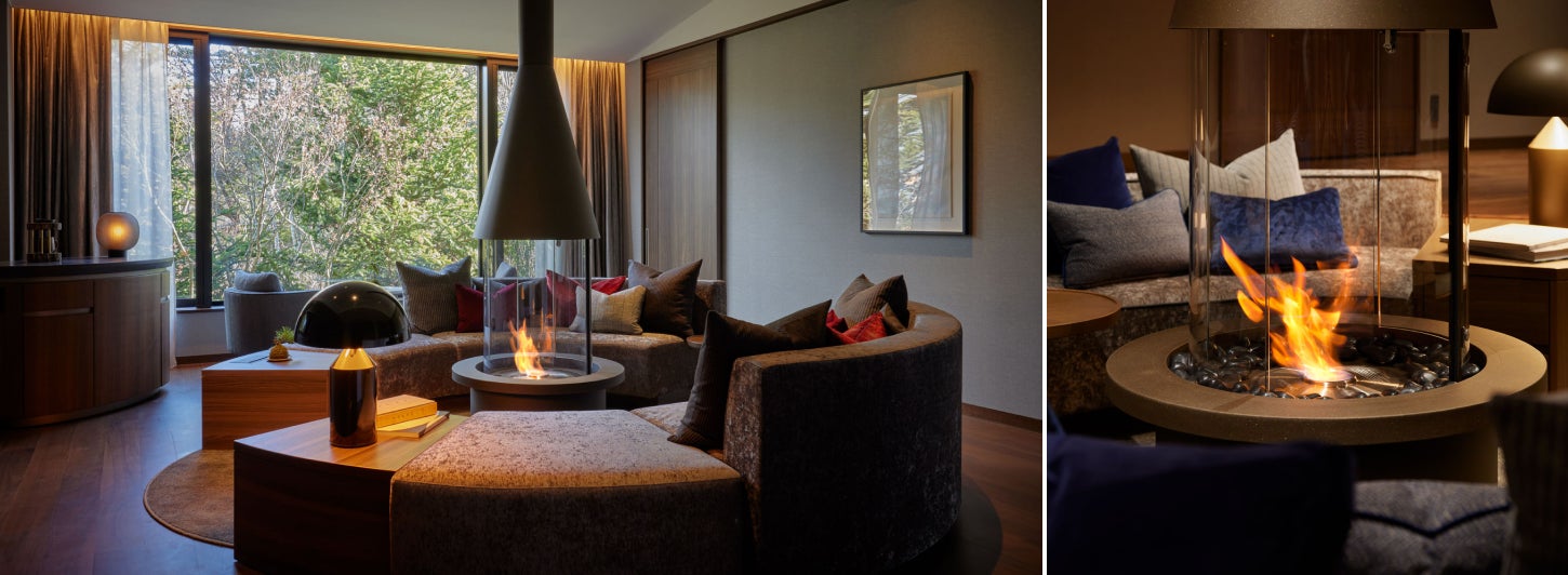 当施設では、各空間に合わせ特別にデザインされたエコスマートファイヤーが全客室に設置されており、特に今回ご用意したラグジュアリースイートルームでは、円柱型の暖炉が客室中央に設置され、心地よい炎の揺らめきを楽しむ贅沢なひとときをお過ごしいただけます。