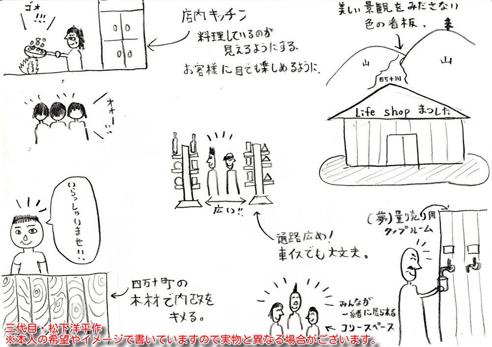 店内には観光客や地域住民が憩いの場として使用できるコミュニティスペースも設置。フリーWIFIも完備(予定)し、スマートディスプレイを店内に一台設置することで高齢者や日本の将来を担うであろう若者にもそのテクノロジーについて興味をもってもらえるような仕掛けをつくっています。そして通路は、車椅子での来店に対応できるよう広めの通路設定にしています。壁紙や床も林業が盛んな四万十町をイメージし木目調に仕上げ随所に夫婦二人のこだわりが垣間見られます。