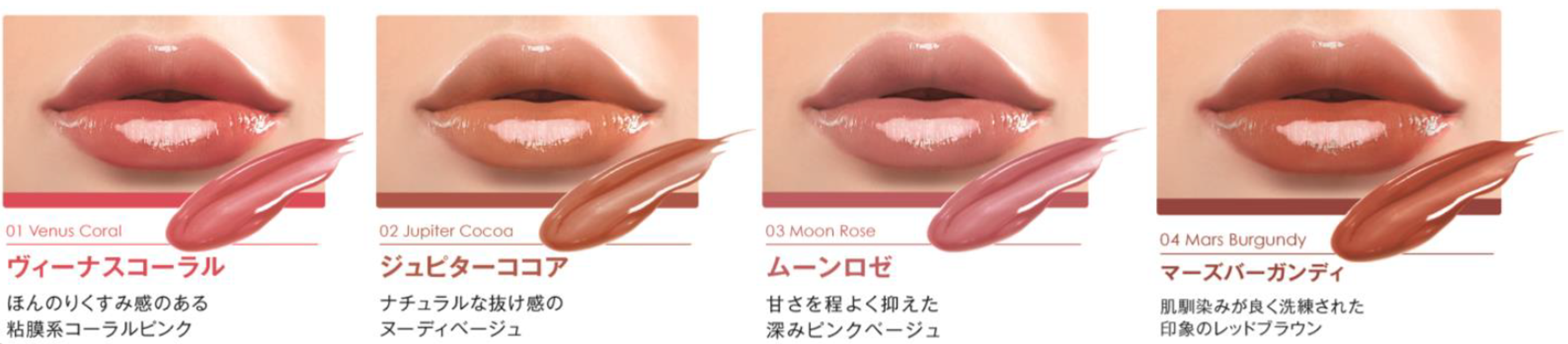 左から01 ヴィーナスコーラル、02 ジュピターココア、 03 ムーンロゼ、 04 マーズバーガンディリップガーディアン グロウラッピングティントL<リップカラー> 数量限定