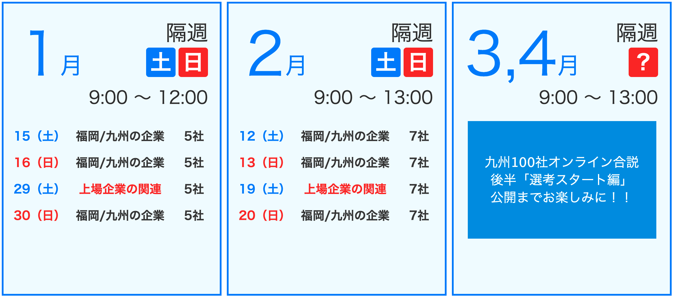 「九州100社!オンライン合同説明会」は、九州に拠点をもち新卒採用を行う会社が100社オンライン登壇するイベントになります。1月2月の開催では冬期インターンの話、3月4月の開催では選考の話が聞けるイベントとなっております。