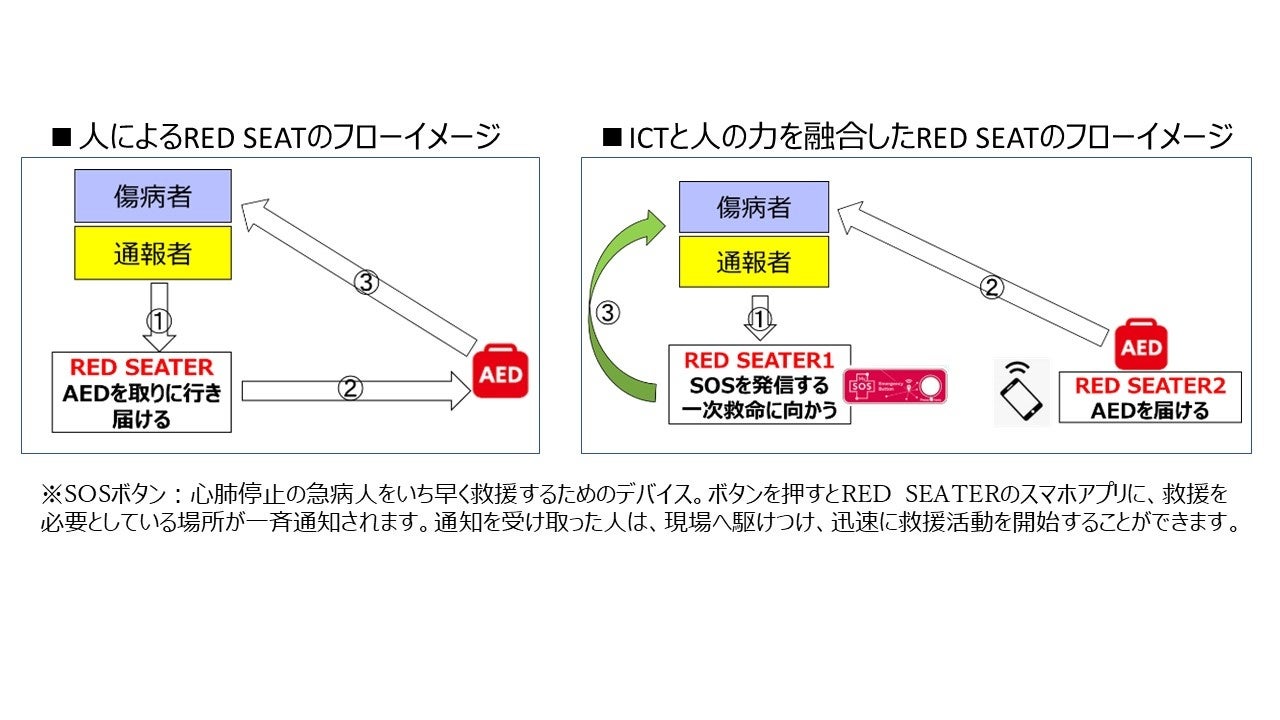「RED SEAT」はスタジアムでAEDを必要とする方に1秒でも早くAEDを届けることでスポーツ観戦中の心臓突然死ゼロを目指す取り組みです。心臓突然死は年間約79,000件発生しています。いつ、どこで、誰に起きてもおかしくない病気で、スポーツ観戦中に興奮して心臓発作を起こす人もいます。心停止が起きた際、その救命率は1分経つ毎に10%低下しますが、スタジアムのような広い場所でAEDを現場に即座に届けることは容易ではありません。そのようなスポーツ観戦中の心停止による死亡者をなくすため「RED SEAT」システムが考案されました。