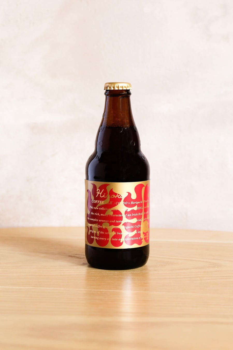 クラフトビールメーカーの株式会社協同商事コエドブルワリーと7年目となるコラボレーションを実施し(注2 詳しくは「コエドブルワリーとのコラボレーションに ついて」をご覧ください)、コーヒーエール「緋ノ香-Hinoko-」を9月13日(金)から期間限定で発売します。この商品は堀口珈琲が焙煎したコーヒー豆を、コエドブ ルワリーが醸造したビール(ベースビール)に漬け込んでつくられます。今年のスタイルはモルトの豊かな風味が特徴的な「アイリッシュレッドエール」。さらに、コラ ボレーション初となる、焙煎度違いの2種のコーヒー豆を漬け込み、より複雑な風味 を表現しました。モルトの甘く華やかな香りのベースビールに、濃密な甘さと力強苦みのタンザニア「ハイツ農園」の極深煎り(イタリアンロースト)と、柑橘を思わせる明るい軽快な酸味と華やかな香りが特徴のエチオピア「ゴロ・ベデッサ ウォッシュト」の中深煎り(シティロースト)を漬け込みました。ビールとコーヒーそれぞ れの香りとコクが合わさり、複雑で重層的な味わいが楽しめます。
