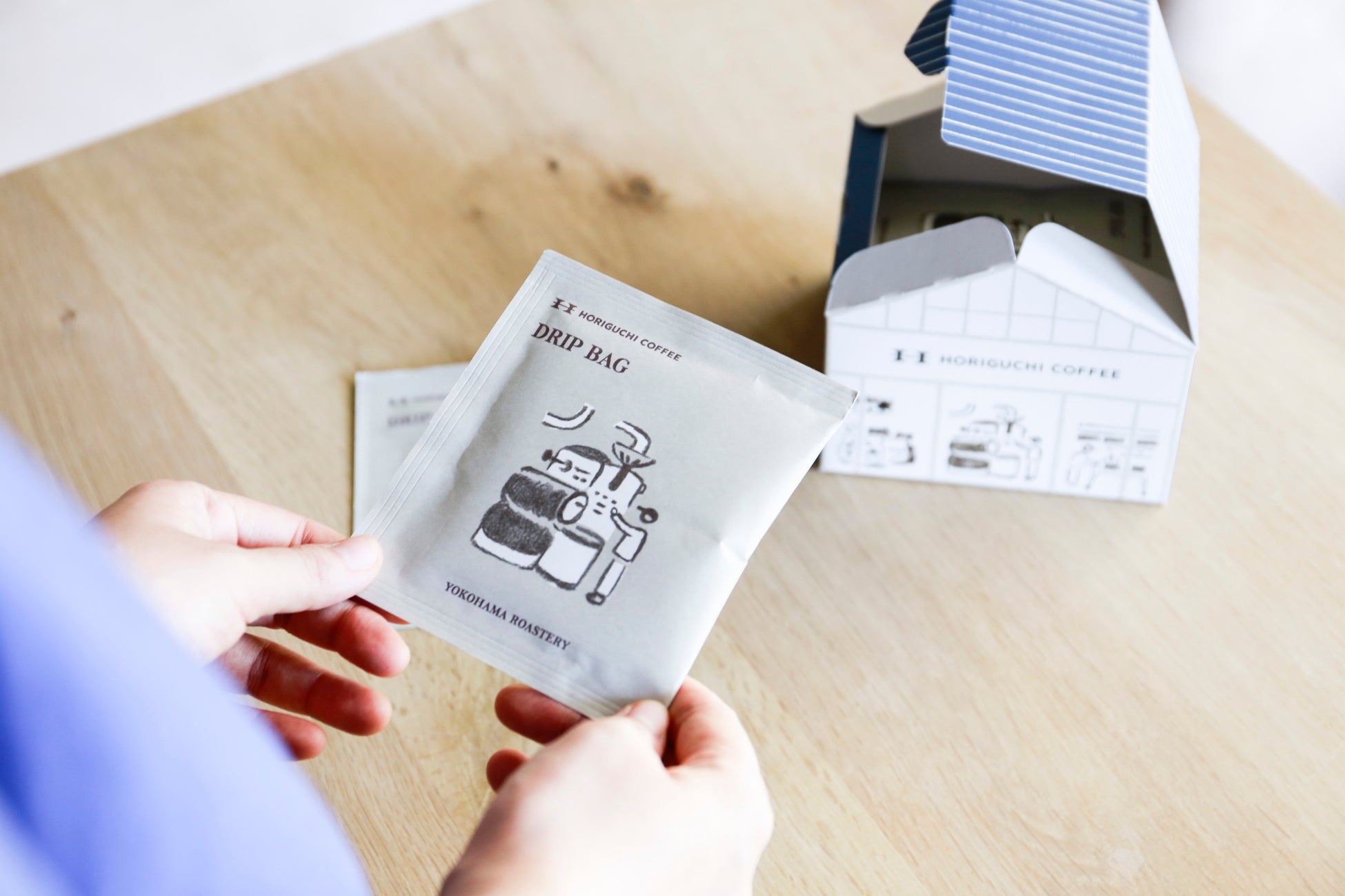 2019年に新設し、開業5周年を迎えた堀口珈琲の焙煎施設「横浜ロースタリー」(注1 詳しくは「横浜ロースタリーについて」をご覧ください)。お客様への感謝の気持ちを込めて、横浜ロースタリーの建物の形を模した外箱デザインのドリップバッグを9月25日(水)に発売します。世界中の産地からコーヒー生豆が届けられる横浜港。この港町横浜を象徴する「海」や「空」にあわせて、外箱の天井や側 面には青色を使用しています。正面にはコーヒー生豆の麻袋や、焙煎・ハンドソー ティング(選別)の様子、側面にはコーヒーをドリップしている人物など、横浜ロースタリーでのコーヒー作りが描かれています。この商品をきっかけに、横浜ロー スタリーでのコーヒーづくりを知ってもらいたいという願いを込めました。現在、 月に数回実施中の「横浜ロースタリー見学会」でも販売するので、横浜土産としてもご活用いただけます。