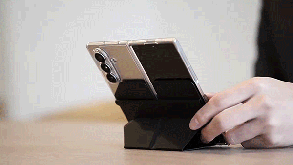 折りたたみスマホ(Fold)に最適設計し、スタンド接地面積が従来品と比べて「2倍」に。