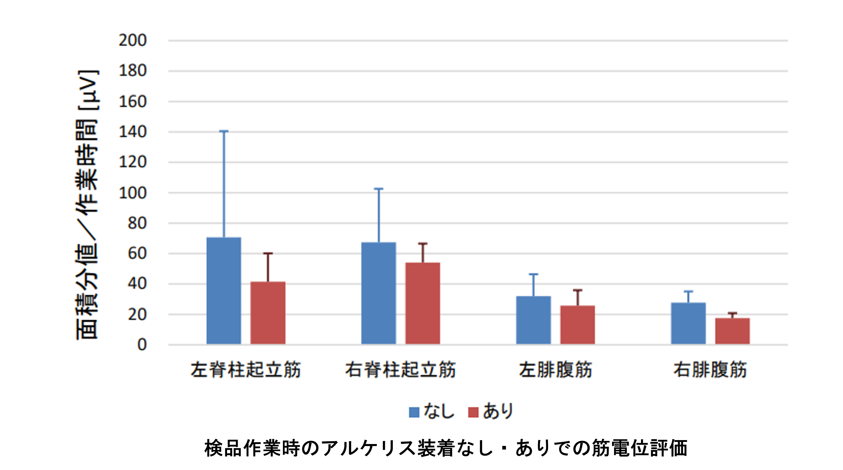 ①模擬作業において、両側脊柱起立筋(腰部)・両側腓腹筋(ふくらはぎ部)の筋活動が最大41%減少しました。(減少率:左側脊柱起立筋41%、右側脊柱起立筋20%、左腓腹筋20%、右腓腹筋37%)②主観評価である「疲労部位しらべ」において、作業により生じる腰部の疲労感が、アルケリスの使用により軽減する可能性が示唆されました。