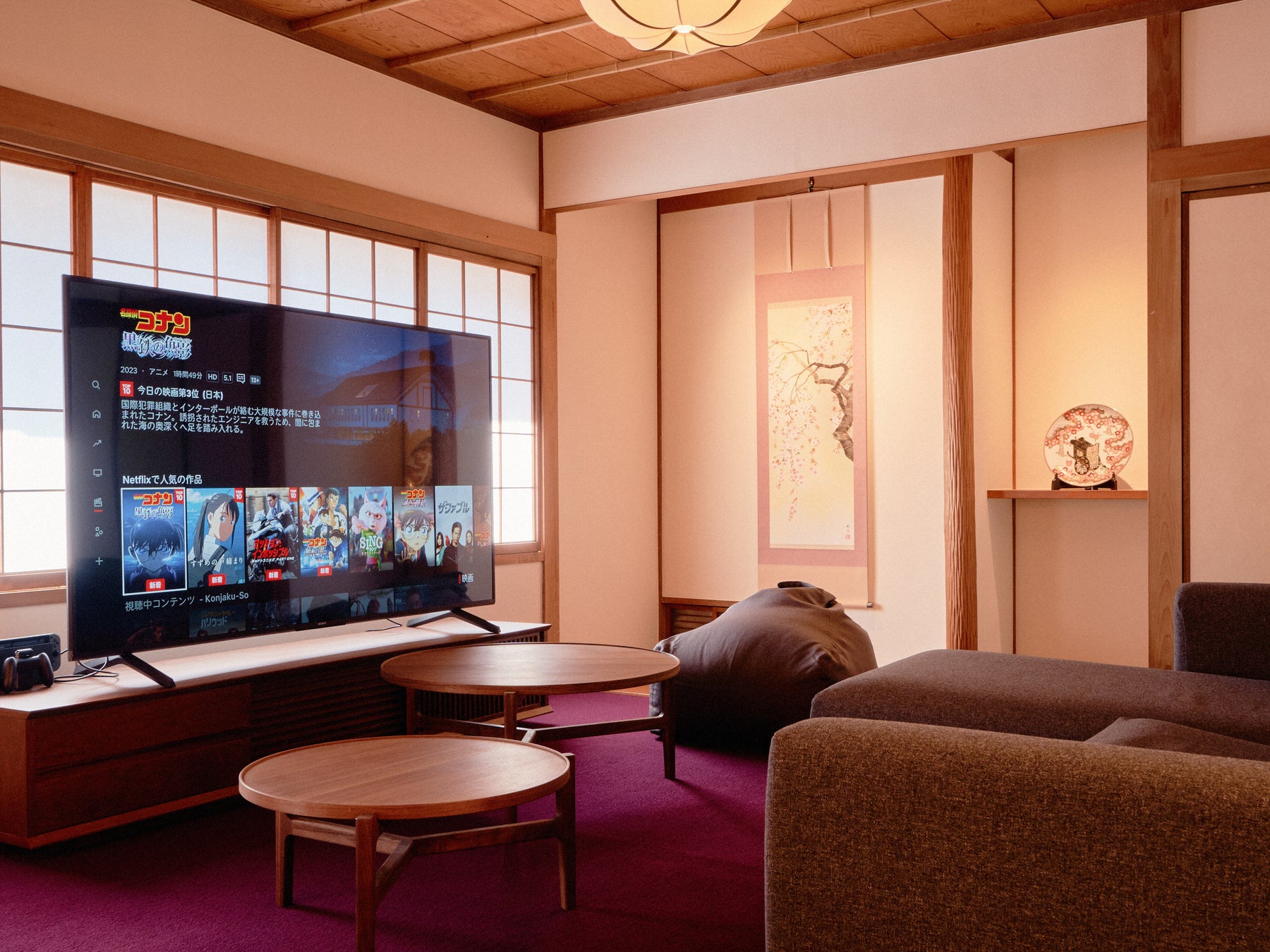 ご友⼈やご家族グループでゆったりと団らんしていただきたいという思いから、リビングルームや寝室には⼤きくスペースを確保しております。レトロな雰囲気を醸すインテリアに囲まれながら、⼤きな画⾯でテレビゲームやネットフリックスなどの各種配信サービスを楽しむことも可能です。