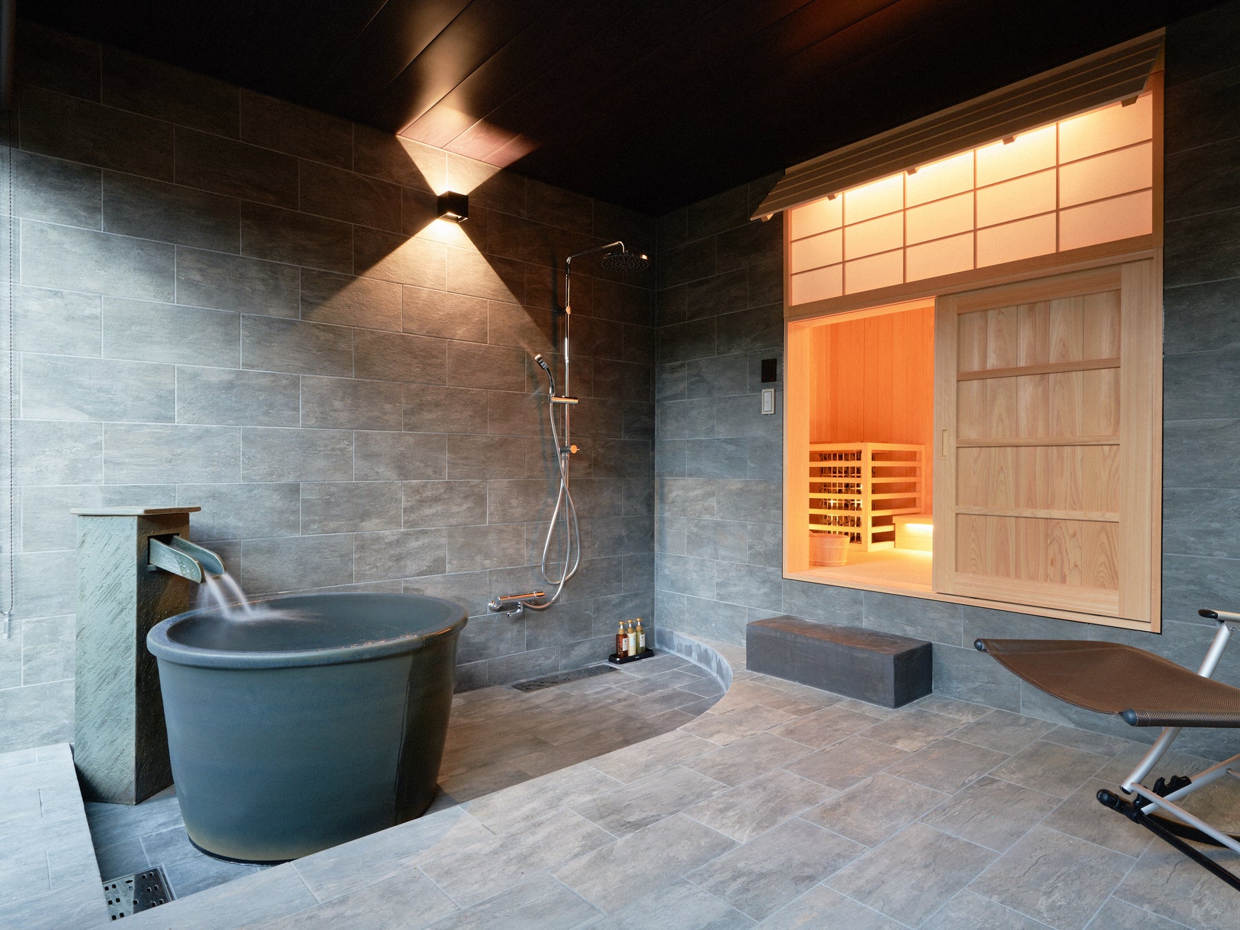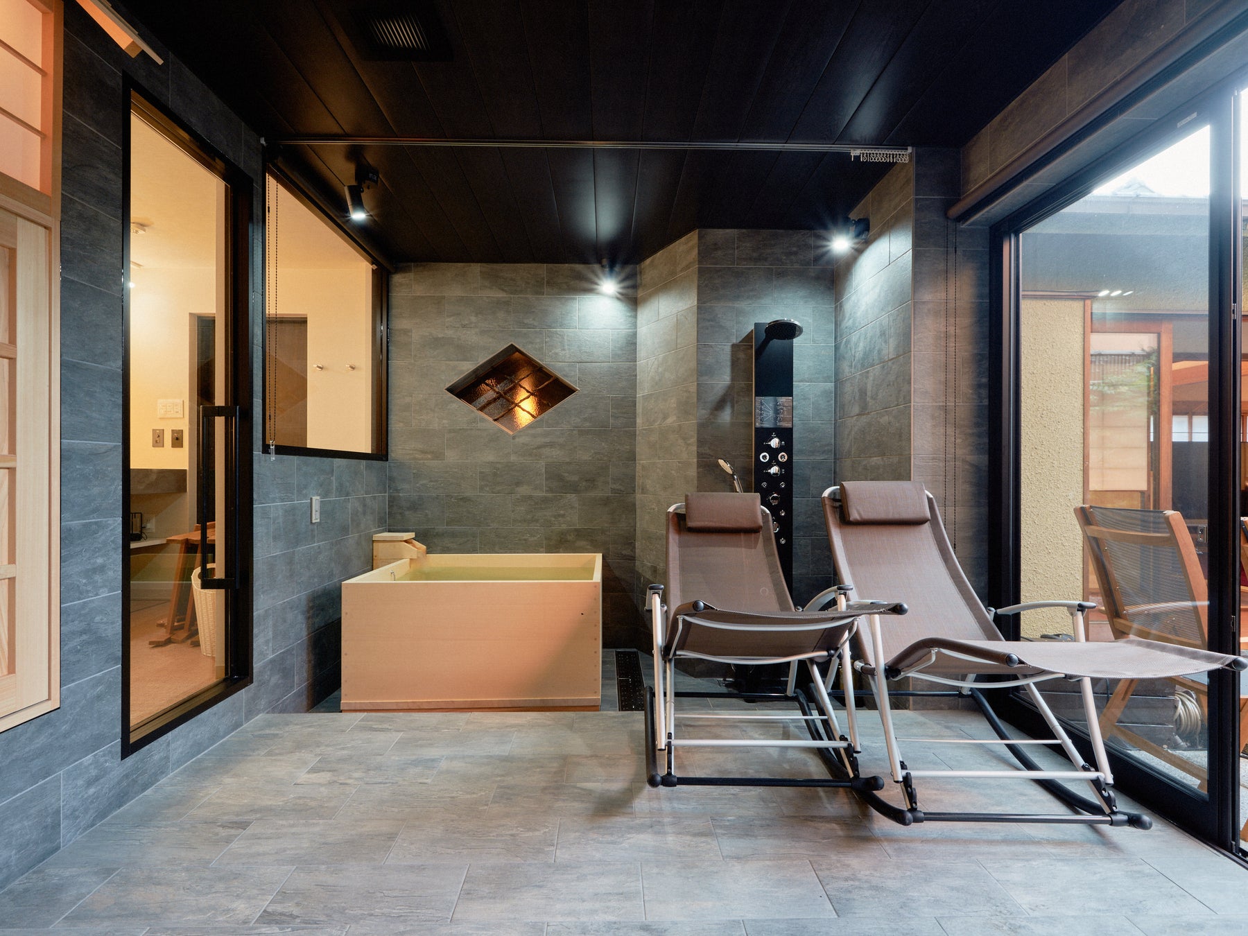 プライベートサウナの隣には半露天⾵呂も備えております。