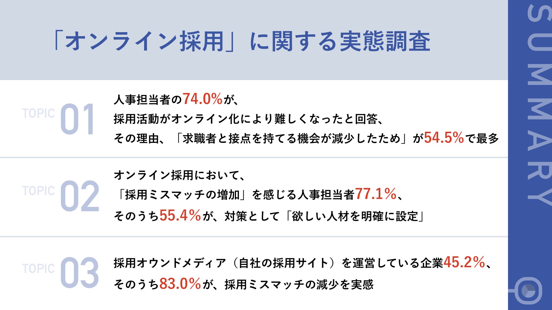 今回の調査では、新型コロナウイルス感染拡大の影響で、人事担当者が採用活動をオンラインで進めるにあたり、求職者の人間性を読み取ることや、自社の魅力を伝えることが困難となり、自社と相性の良い人材を確保することが以前よりも増して難しくなっていることが分かりました。「欲しい人材を明確に設定する」、「複数の採用担当者が接触する」など、様々な対策が取られているものの、手応えを感じている担当者は少ないようです。数ある対策のうち、「採用オウンドメディア」導入済み企業においては、採用ミスマッチが減少したとの回答が一定数見られ、未導入企業においても、「採用オウンドメディア」の重要性が認識されています。採用活動のオンライン化を採用市場におけるニューノーマルとして捉え、採用のミスマッチを最小限に抑えるためには、採用オウンドメディアの活用が有効な手段と言えそうです。