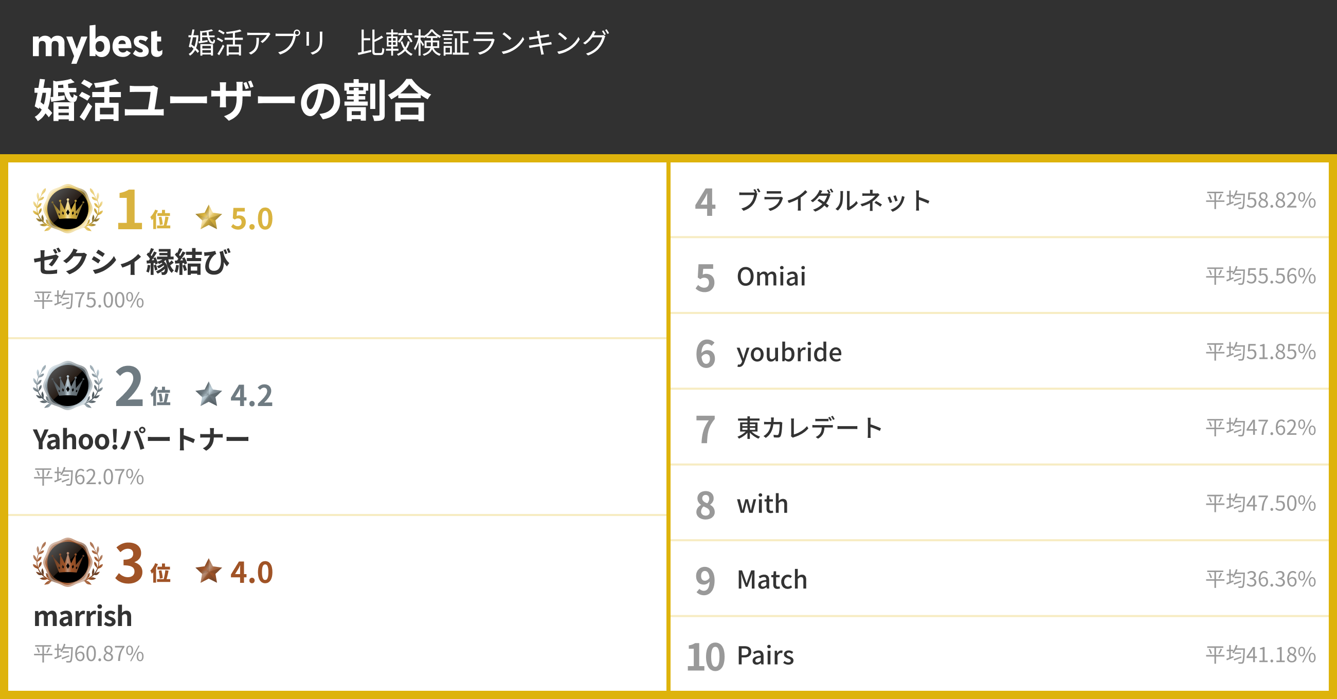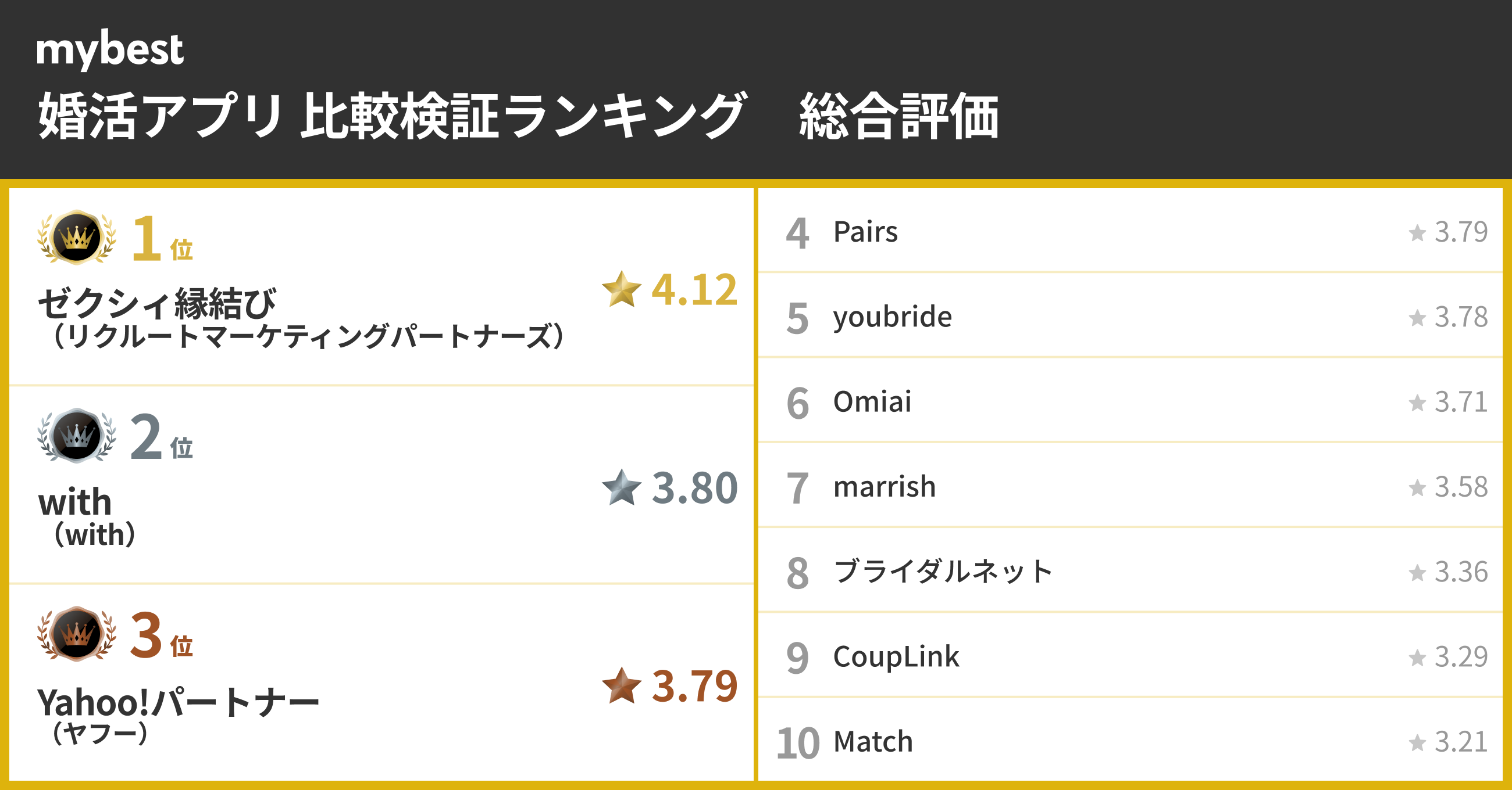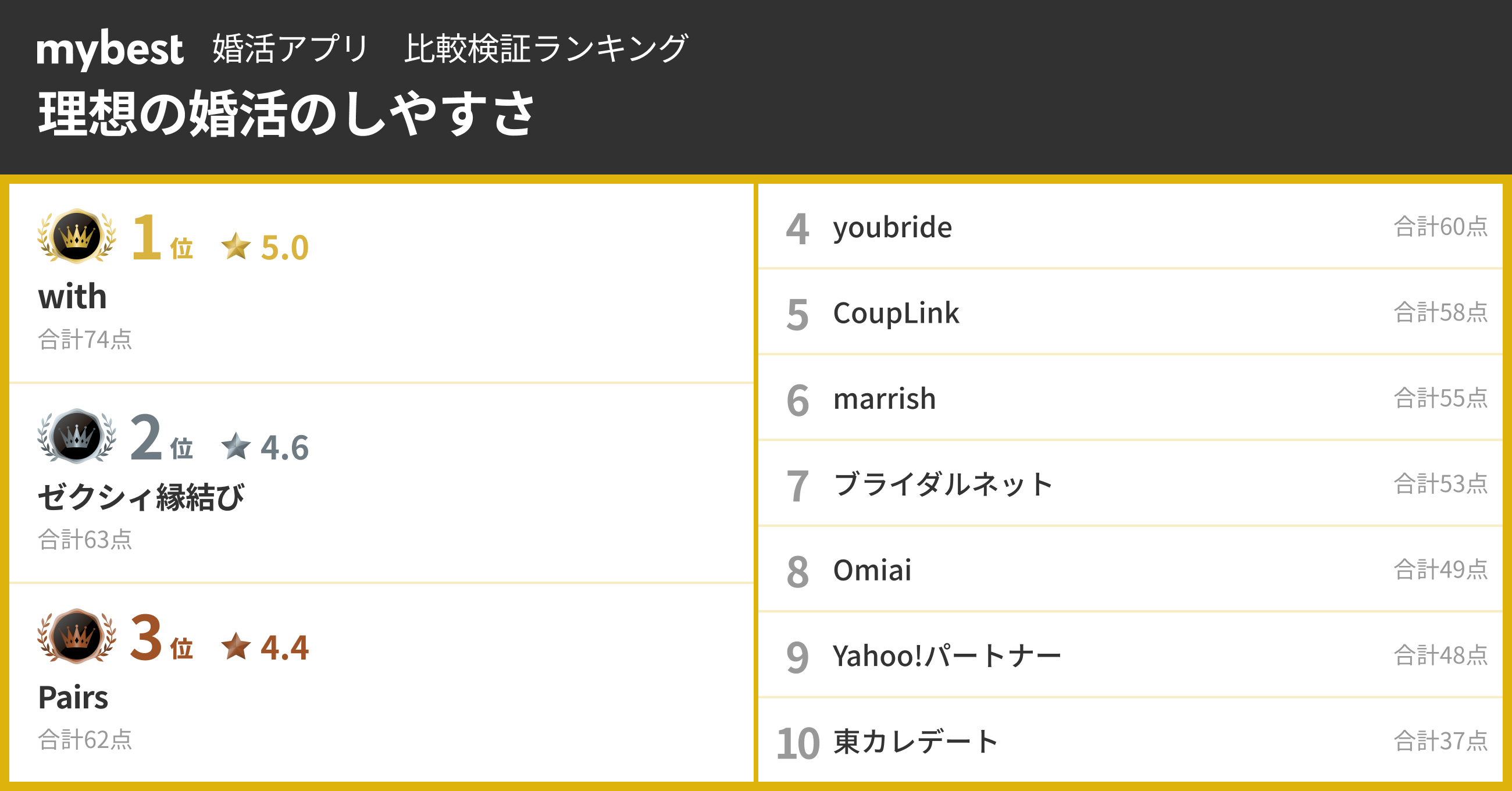 【婚活アプリ総合ランキング】3位Y!パートナー、2位with、1位は?アンケートでわかった結婚で重視される3要素の傾向も - mybest