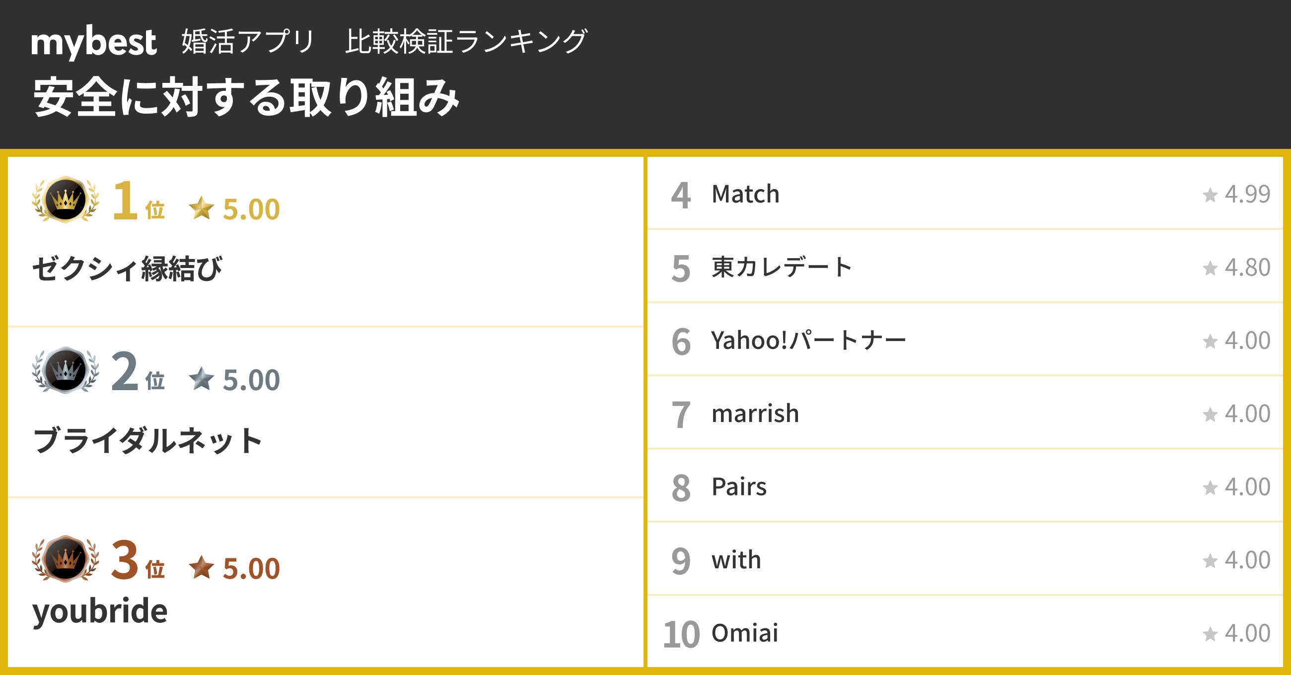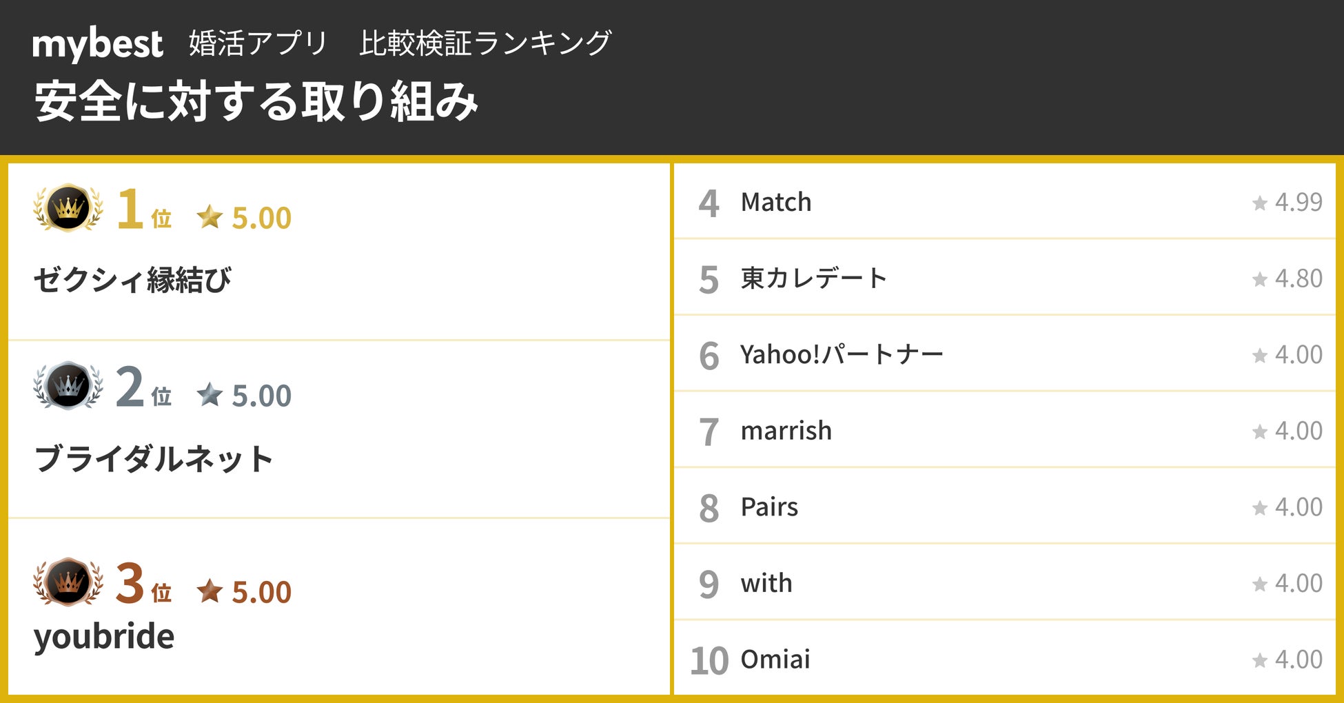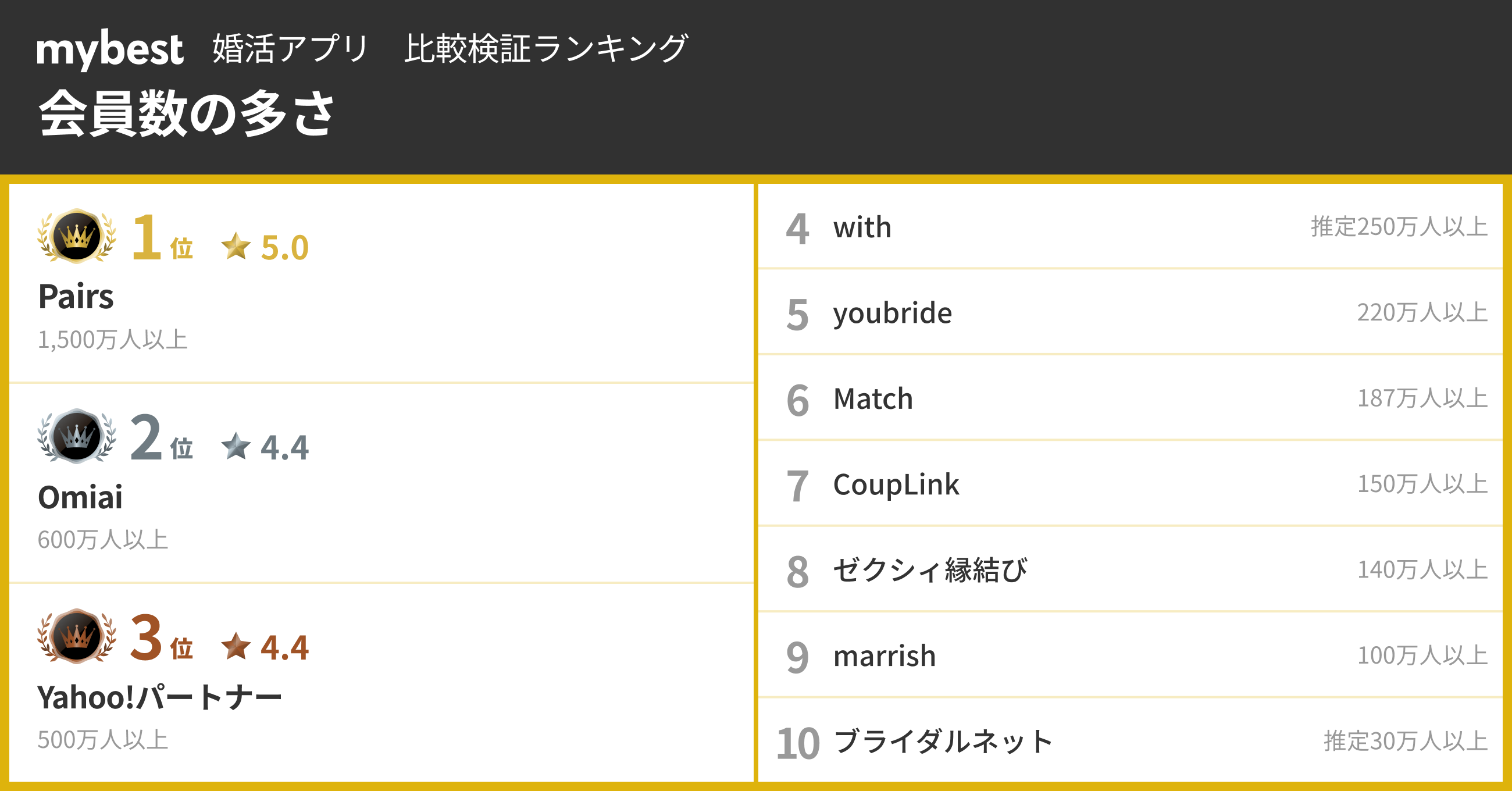【婚活アプリ総合ランキング】3位Y!パートナー、2位with、1位は?アンケートでわかった結婚で重視される3要素の傾向も - mybest