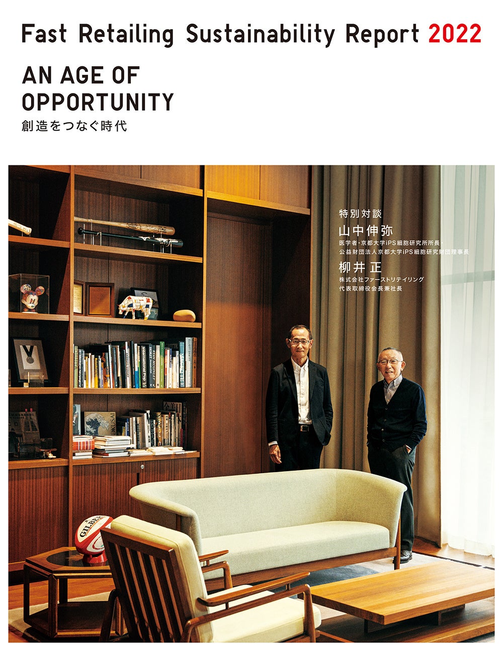 巻頭特集では、医学者で京都大学iPS細胞研究所所長の山中 伸弥氏と、当社代表取締役会長兼社長の柳井 正による特別対談を掲載しています。パンデミックの長期化によって生まれた課題から、その先の未来へ踏み出すための道筋を2度にわたる対話を通し探りました。最先端の科学技術やデータ、情報だけでは予測しきれない状況の中、何が世界を変える原動力になりうるのか、人類が普遍的にもつ良識や分野を超えたつながりを見つめ直しました。続く特集ページでは、「あらゆる人の生活を豊かにする究極の普段着」というLifeWearのコンセプトを進化させ、服の「新しい産業」の創出を目指すファーストリテイリングのビジョンをもとに、気候変動への対応や廃棄物削減、循環型社会の実現に向けた取り組みを紹介しています。