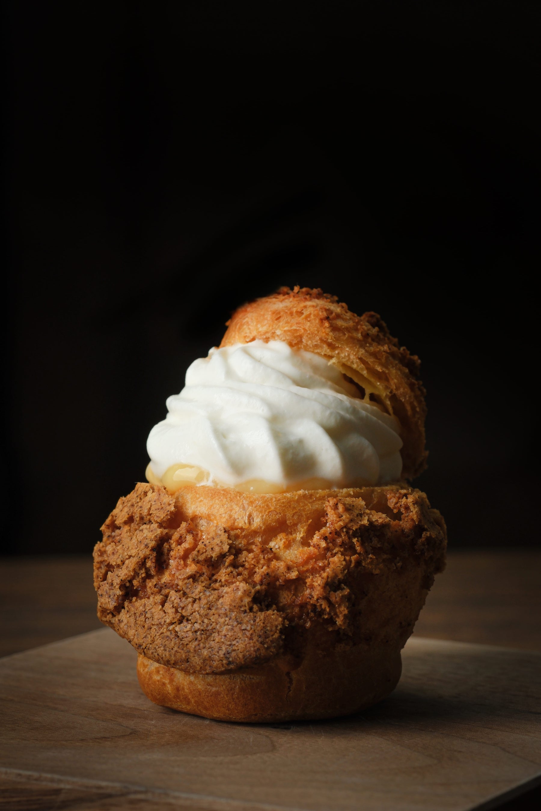 コーンロッシュというフランスのシリアルクッキー生地を上にのせたガリガリ食感のシュークリームです。