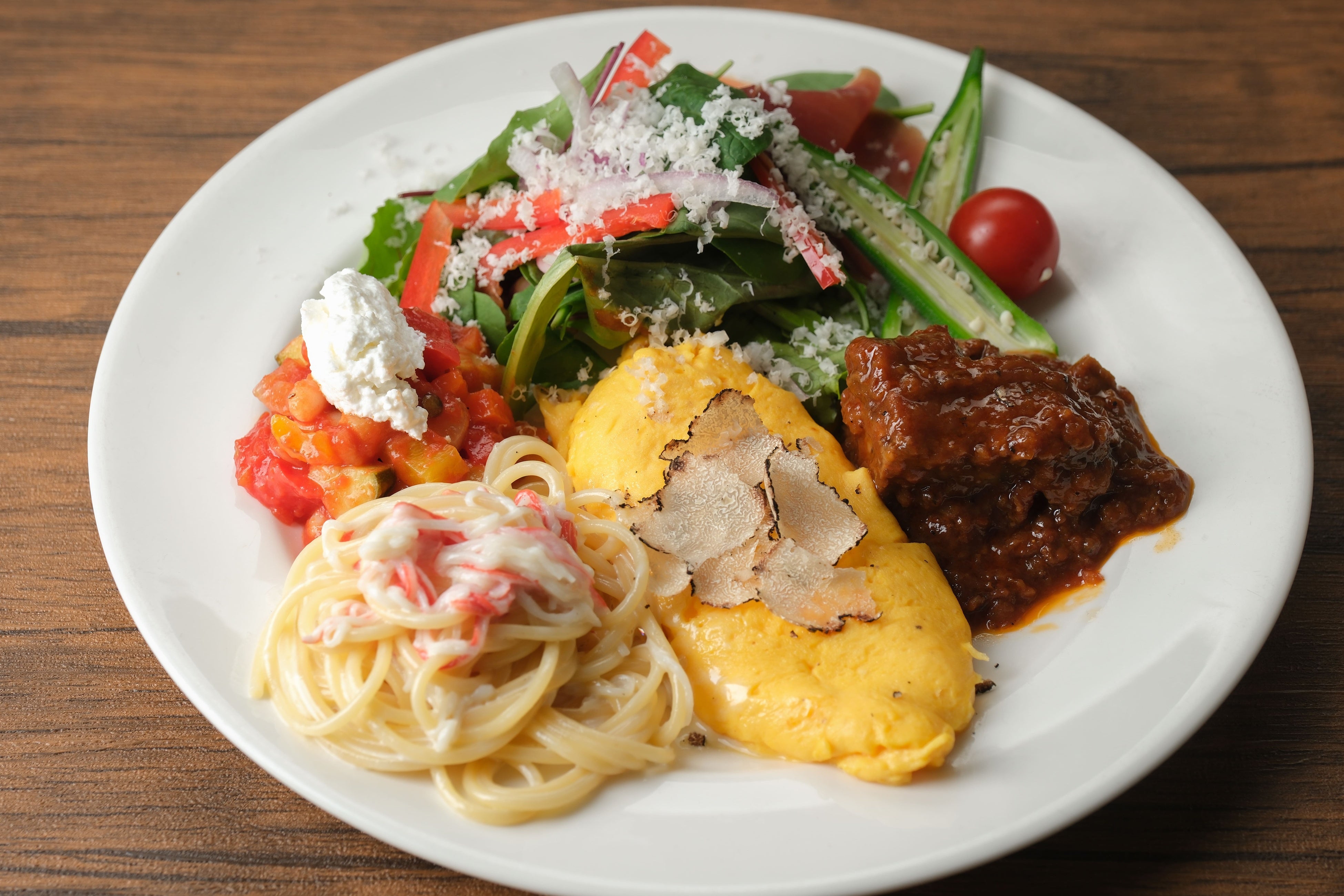 セントベーネおすすめの半熟トリュフオムレツやパスタ、お肉などの盛り合わせ。