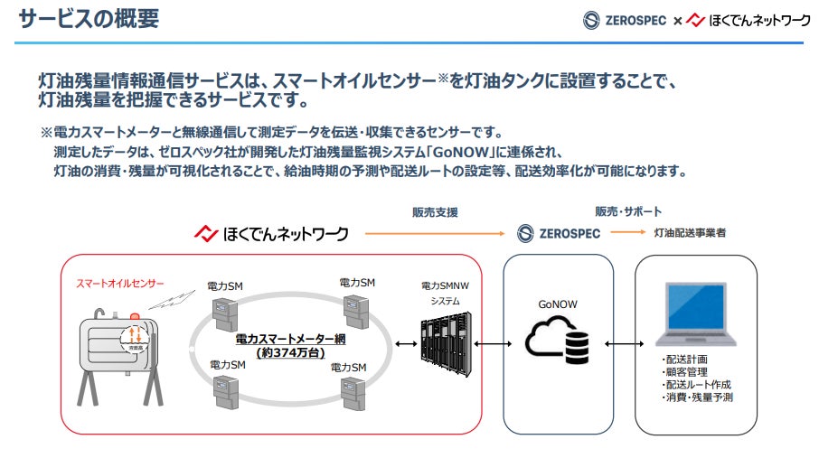 北海道の灯油等配送事業者(以下、「配送事業者」)はドライバー不足や物価上昇に伴う配送経費の増加といった課題に直面しています。両社はこれらの課題解決のため、これまで、電力スマートメーターの通信網を活用して灯油残量を遠隔で確認できるスマートオイルセンサーの開発・実証試験を行うとともに、配送事業者向けの灯油残量情報通信サービスを両社各々で提供してきました。