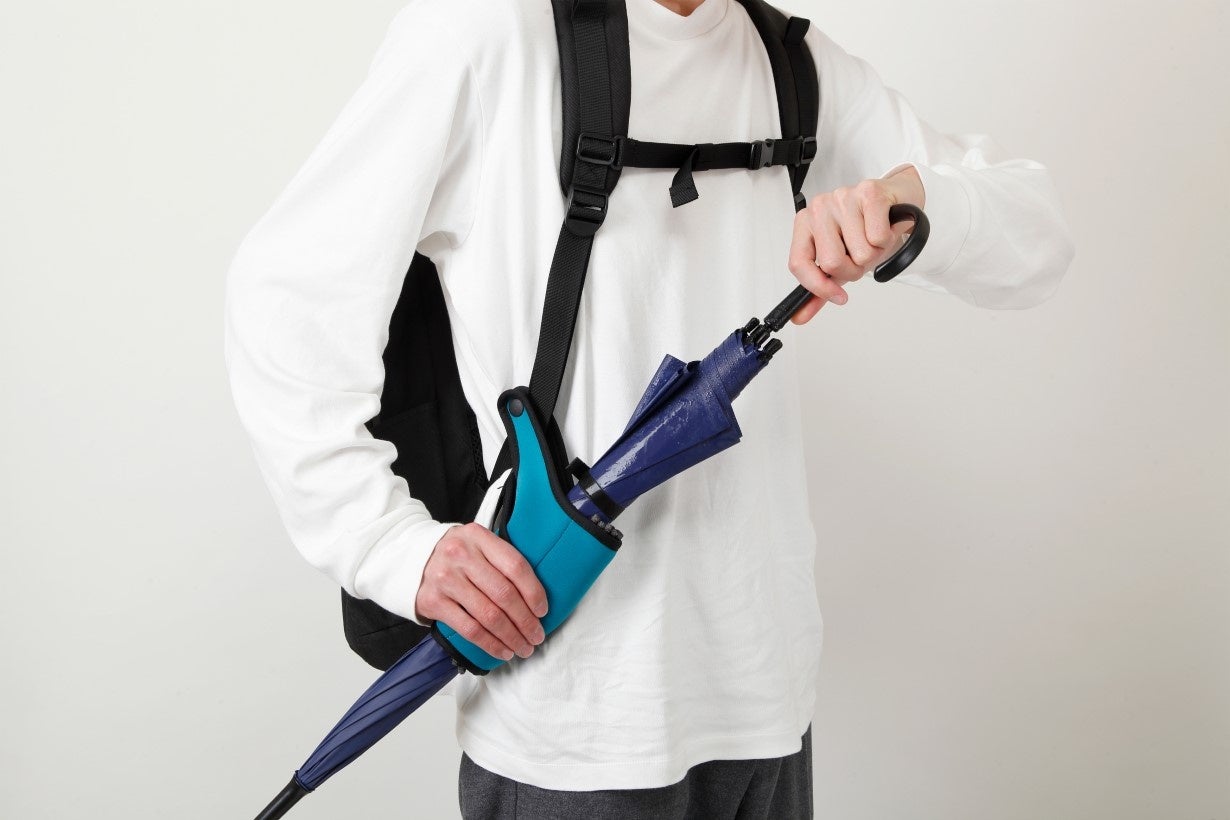 『かさモンM2』の手についているスナップボタンでカバンの取っ手や、リュックのショルダーストラップなどに手軽につけることができます。