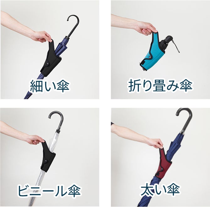 スナップボタンで大まかに固定し、下部にある面ファスナーでしっかりと締め付けることで、太めの傘、細めの傘、折りたたみ傘など直径を問わず、サイズを調整してしっかりと固定可能です。