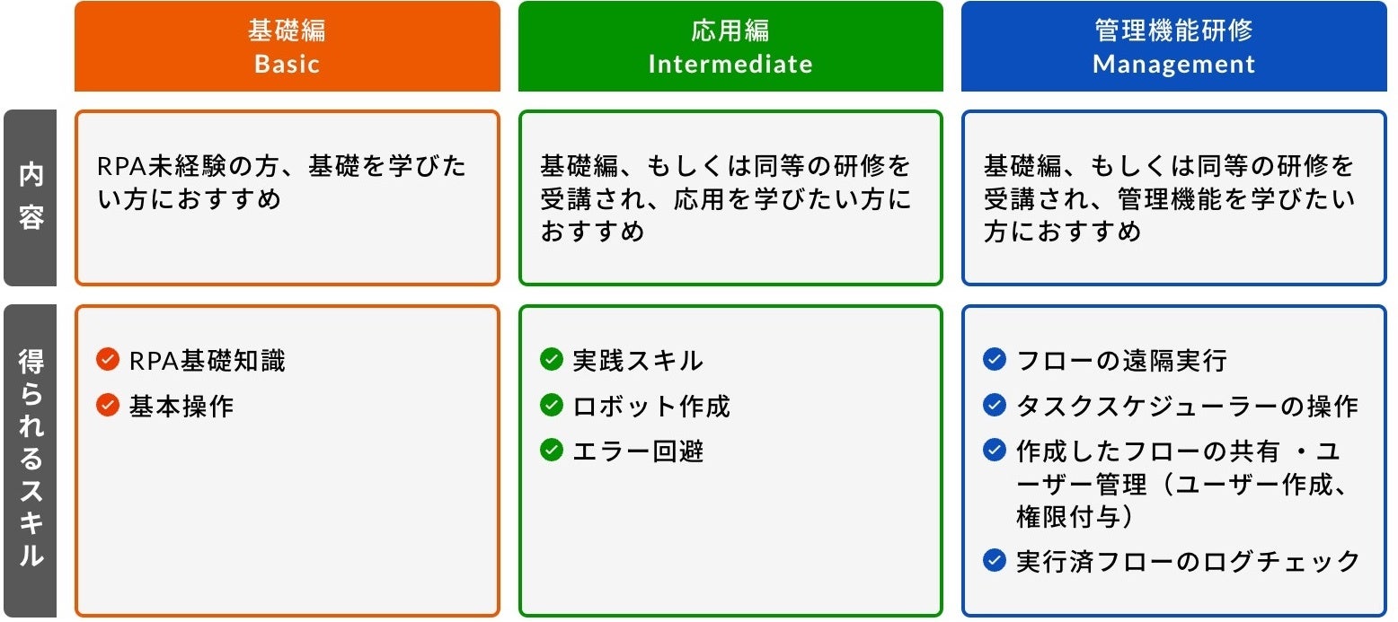 - 初心者向けの基礎編に加えて、受講者のスキル別に応用編・管理機能研修なども開催します(Power Automate Desktop)