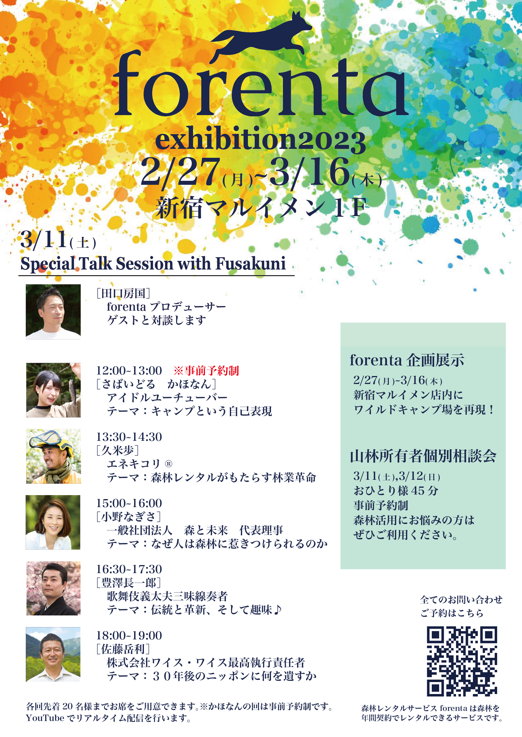 キャンパー向け森林レンタルサービス「forenta(フォレンタ)」を全国展開する株式会社山共(本社:岐阜県東白川村)は2/27〜3/16までの18日間新宿マルイメン1Fで「forenta exhibition2023(フォレンタ エキシビジョン)」を開催することを発表します。