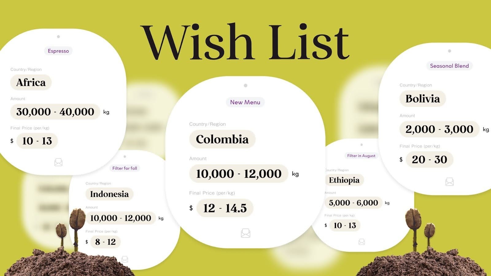 ウィッシュリストは、世界中のコーヒー生産者に調達リクエストを公開する機能。希望の品種、精製方法、価格などを登録するだけで、パーソナライズされたオファーが生産者から届きます。