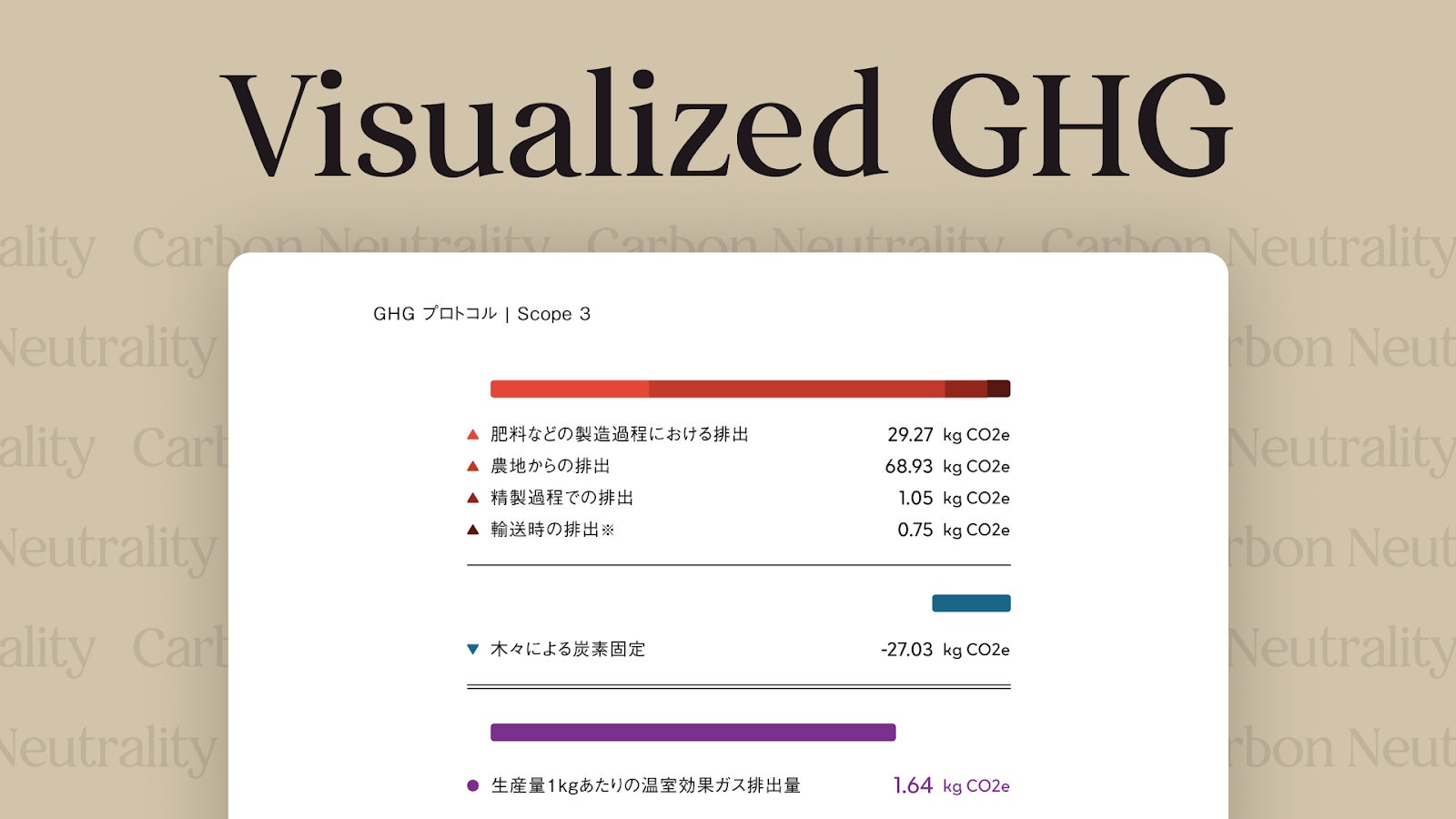 コーヒー生豆の生産と輸送過程における温室効果ガス(GHG)排出量を可視化。来るべき脱炭素社会への適応に必要不可欠なこの機能を、業界に先駆けて実装しています。
