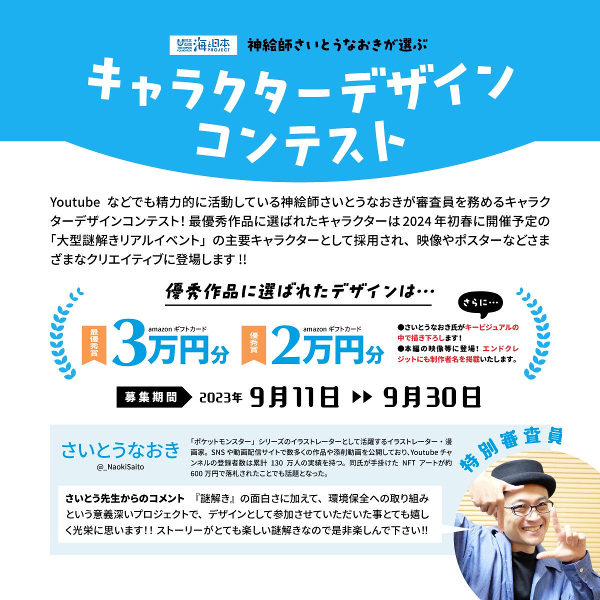最終選考者通知:2023年10月以降に受賞者本人にメールもしくはお電話にてご連絡。また、イベント公式サイトやさいとうなおき氏の公式X(旧Twitter)アカウントなどでも発表予定。