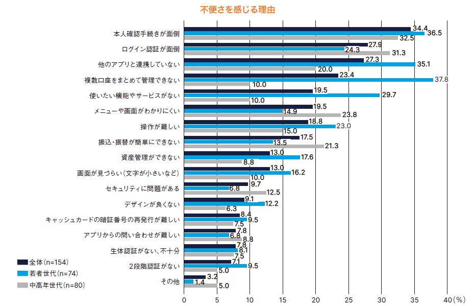 不便さを感じる点を聞いたところ、全体では「本人確認手続きが面倒」という回答が全体のトップとなりました。若者世代では、「複数口座をまとめて管理できない」、「本人確認手続きが面倒」、「他のアプリと連携していない」が上位3項目となりました。若者世代は多くの項目で、中高年世代(40歳代~60歳以上)よりも不便さを感じると回答しており、これらの結果から、特に若者世代の不満を解消する利便性の高い銀行アプリの提供が、市場の成長・発展にとって重要になってくると考えられます。