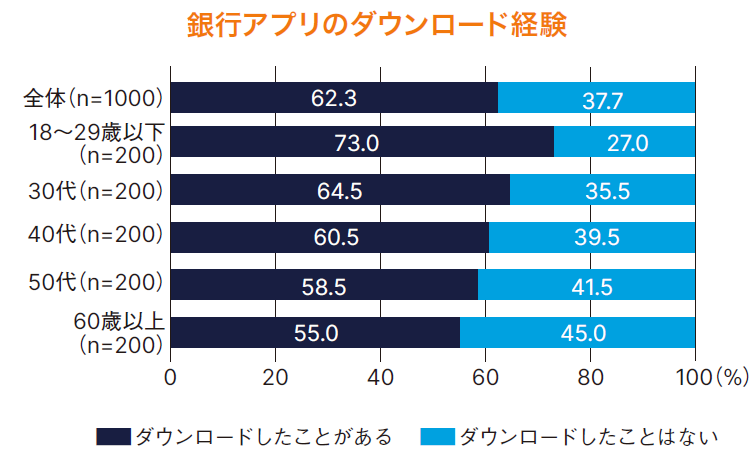 銀行アプリをダウンロードしたことがあると回答した人は、全体の6割を占めました。年代別に見ると、18歳~29歳の若い世代で7割超と最も比率が高く、最も比率の低い60歳以上でも5割を超えるなど、銀行アプリは幅広い年齢層で活用されていることが分かりました。