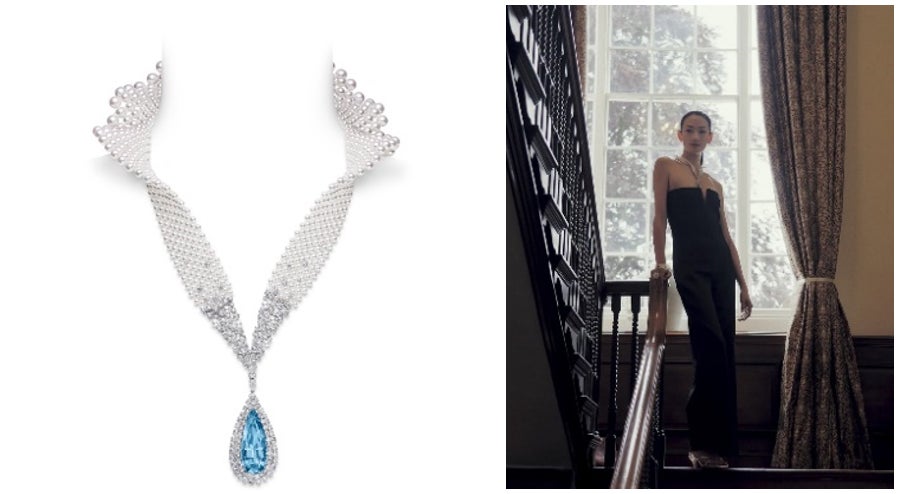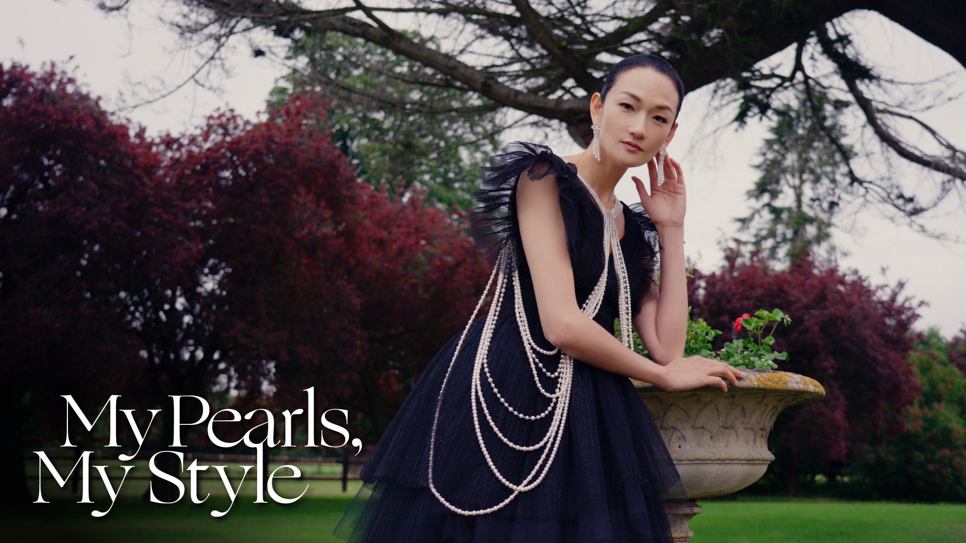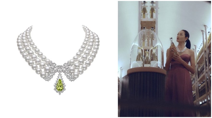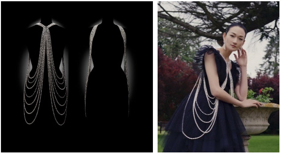 動画では冨永さんが、ミキモトのハイジュエリー4点を纏い登場。洗練されたドレススタイルをさらに華やかにするアイテムです。
