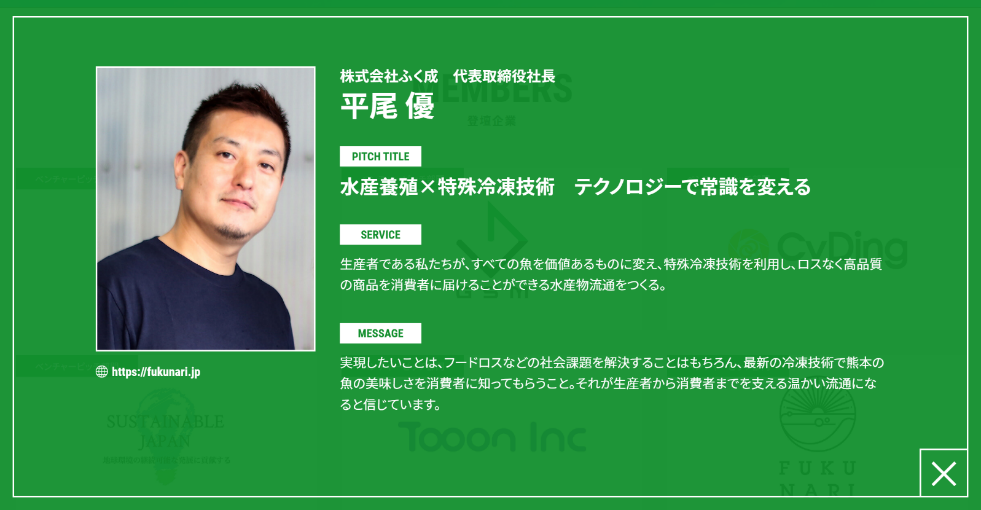 水産物の養殖や加工・販売を手掛ける株式会社ふく成(本社:熊本県熊本市西区、代表取締役:平尾 優、以下ふく成)は、熊本市(経済観光局 産業部 産業振興課 起業・新産業支援室)が主催する「Kumamoto City Pitch」に【ベンチャーピッチ部門採択企業】として代表の平尾 優が登壇します。