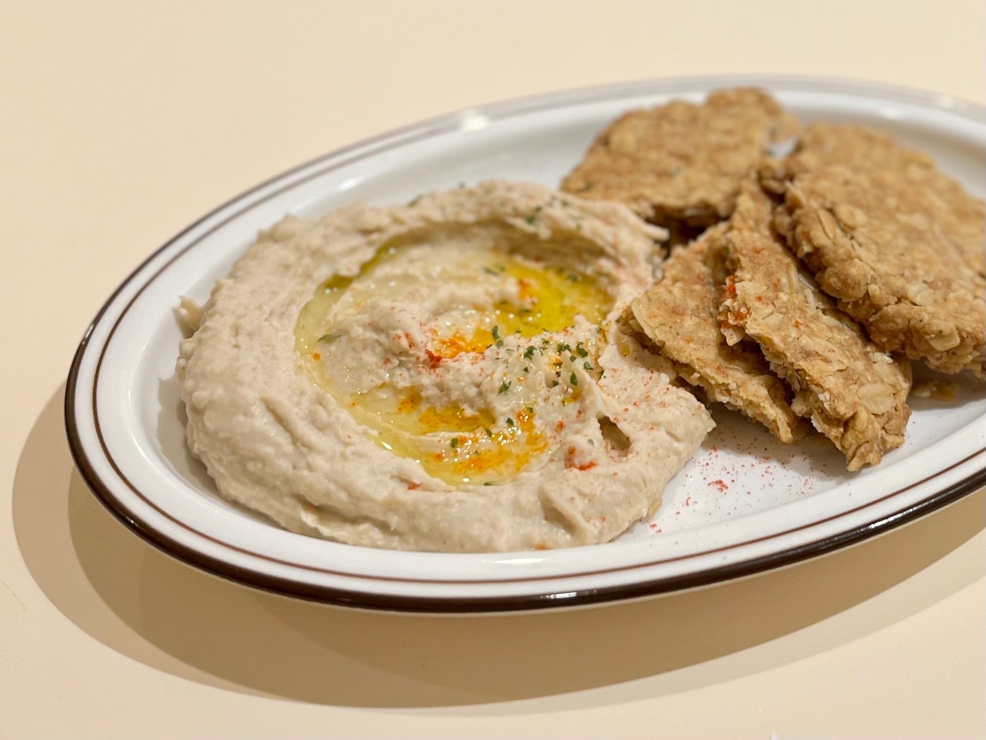フムスに合わせて新しくつくったオートミールのクラッカーをディップしてお召し上がりください❤︎