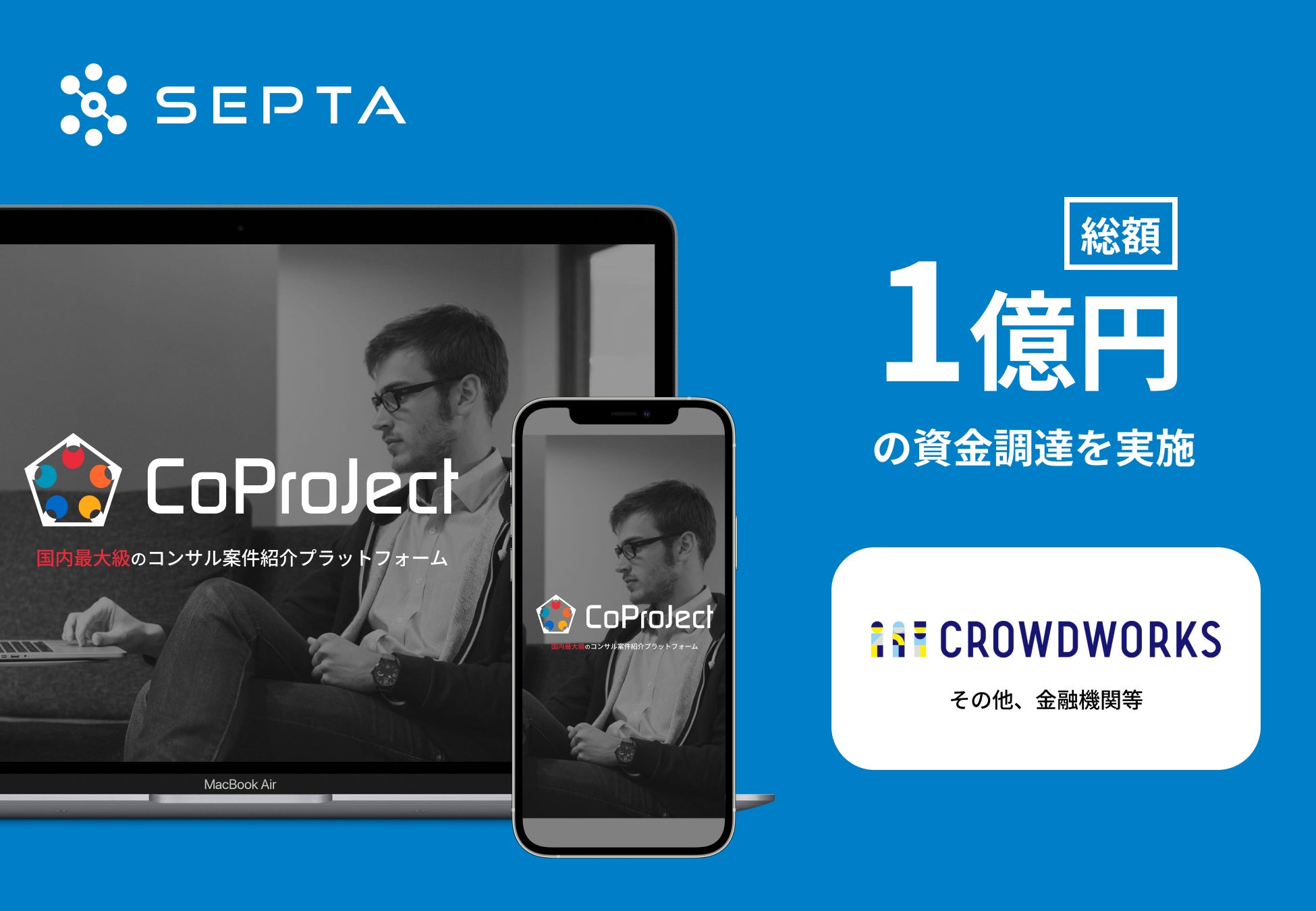 フリーコンサルタント向けプラットフォーム『CoProJect』を運営する株式会社SEPTA(所在地:東京都渋谷区、代表取締役:山口 貴士、以下「弊社」)は、この度、株式会社クラウドワークス(所在地:東京都渋谷区、代表取締役社長 兼 CEO:吉田浩一郎)との資本提携および金融機関からの資金調達を実施し、総額1億円の資金調達を実施したことをお知らせいたします。