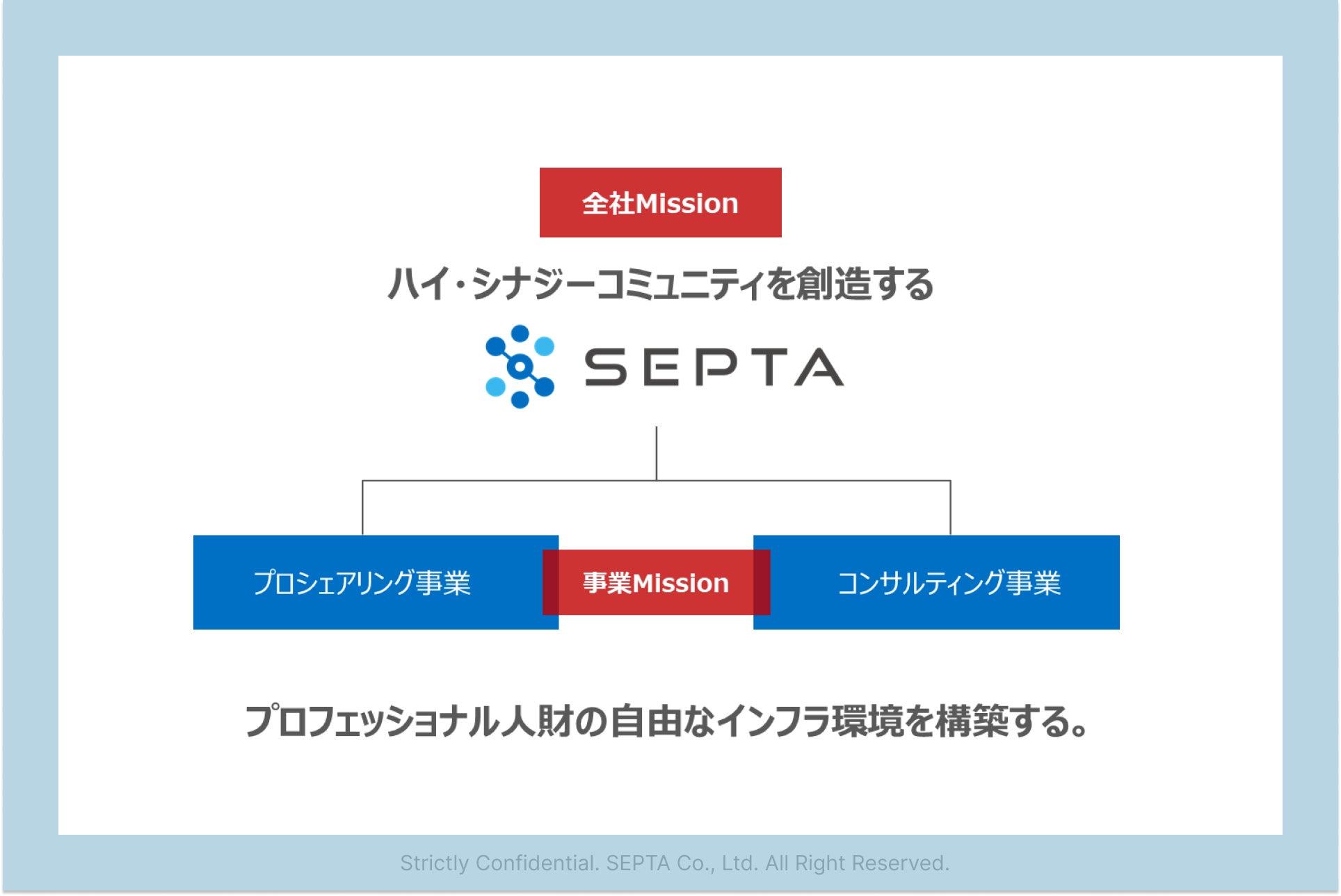 弊社は「ハイ・シナジーコミュニティを創造する」というミッション実現のため、専門家人財に向けたプロシェアリング事業と、外資コンサルティングファーム出身のメンバーを中心に経営課題を解決するコンサルティング事業を行うベンチャー企業です。