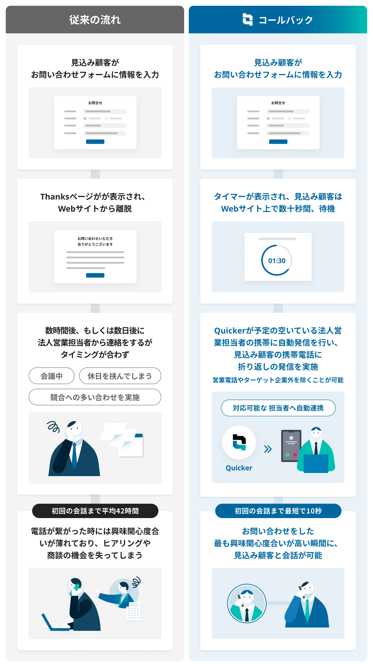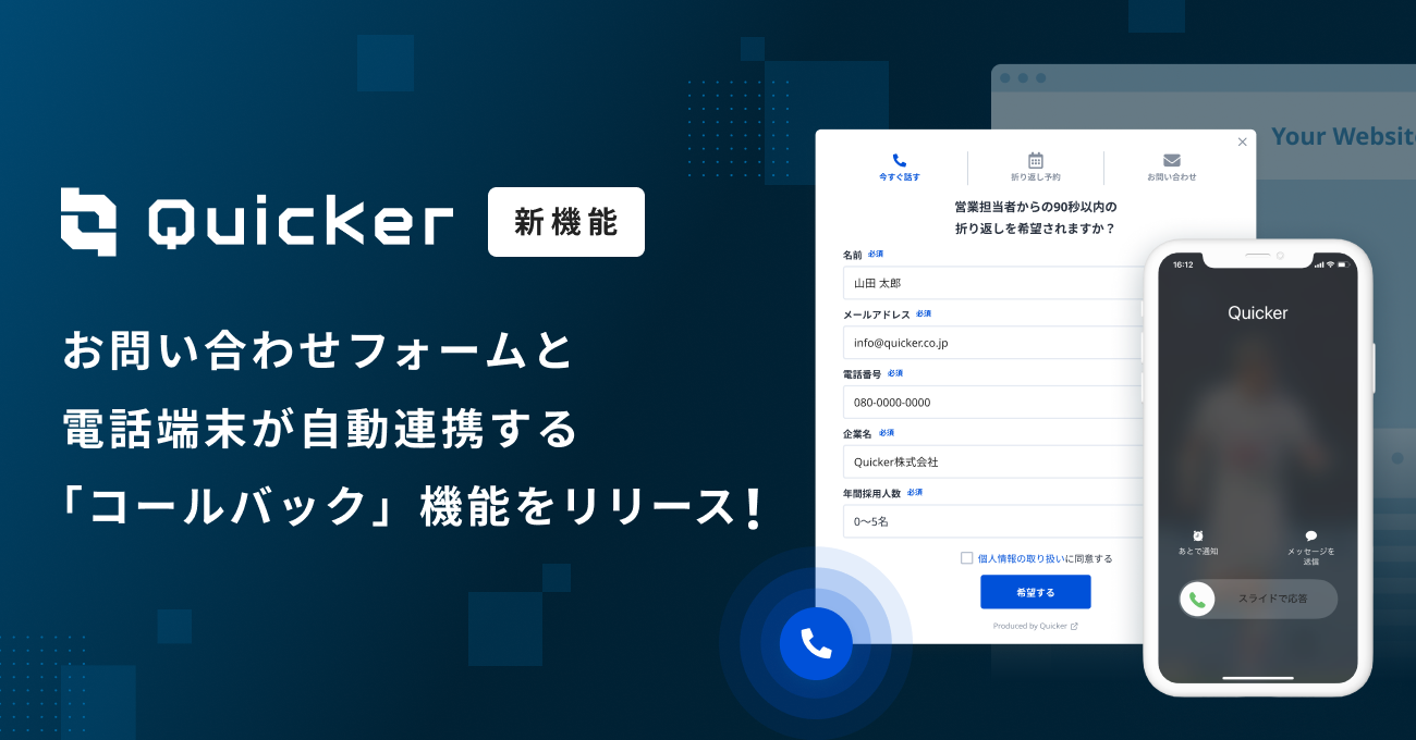 「お問い合わせを頂いたお客様をWebサイトから離脱させることなく、営業担当者の携帯電話端末やIP電話とQuickerが自動連携し、お客様の電話番号に即座に発信を行うことが可能」になります。