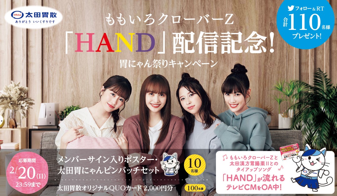 株式会社太田胃散(本社:東京都文京区/代表取締役社長:太田淳之)は、『ももクロ「HAND」配信記念!胃にゃん祭りキャンペーン』として、ももいろクローバーZ「サイン入りポスター」や「太田胃散オリジナルQUOカード2,000円分」が合計110名に当たるキャンペーンを2月13日(日)21:00~2月20日(日)23:59の期間で実施します。